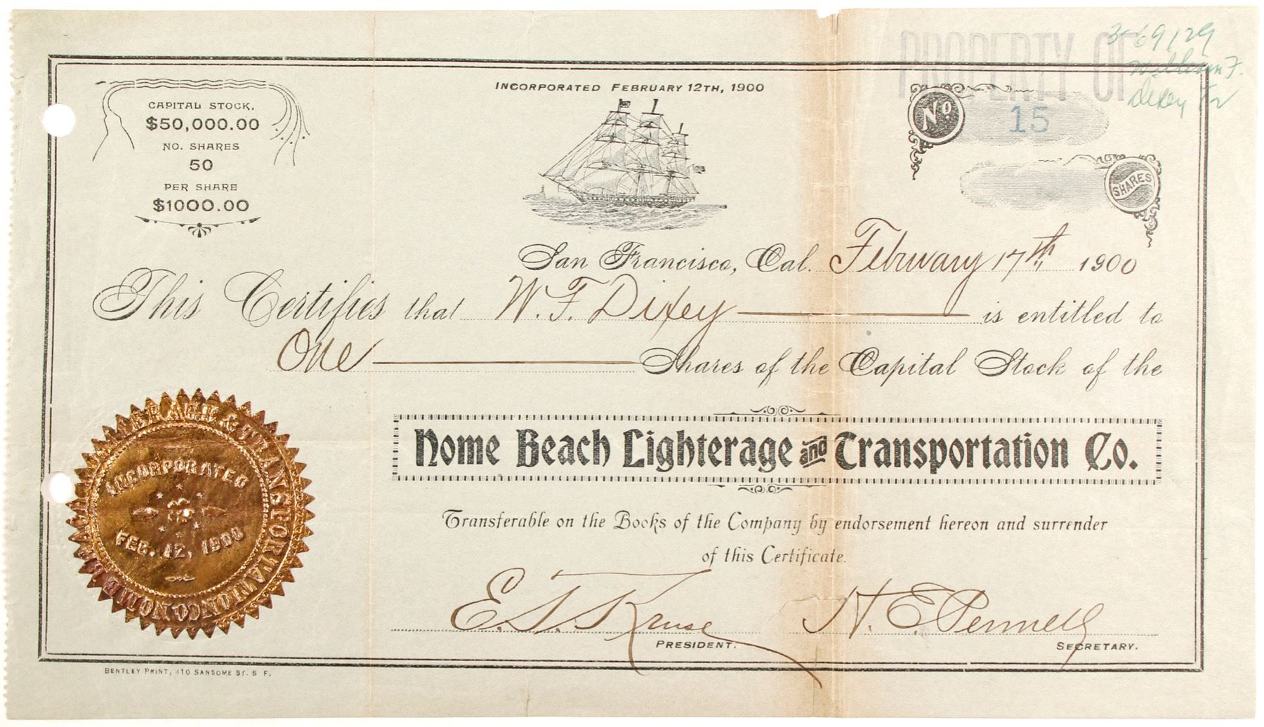 One share of Nome Beach Lighterage and Transportation Co., issued to W. F. Dixey, number 15, dated February 17, 1900 signed by E. S. Kruse, president and H. E. Pennell, secretary. Printed: Bentley Print., Vignette Ship. Ken Prag Collection. State: Alaska City: Nome Date: HWAC# 83635