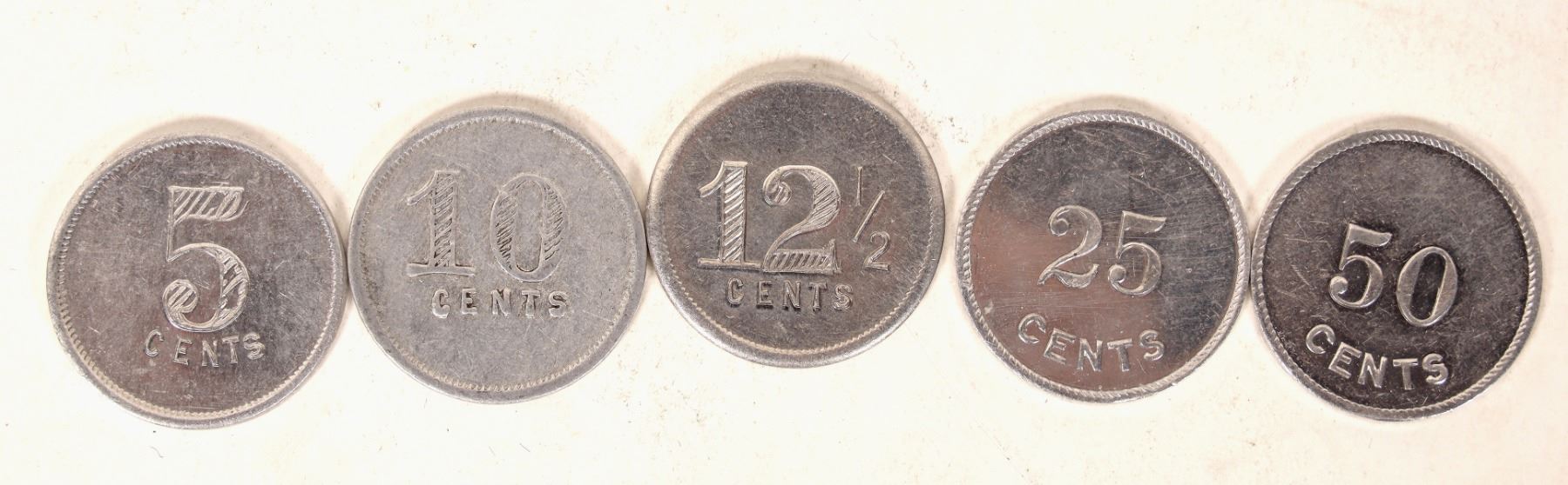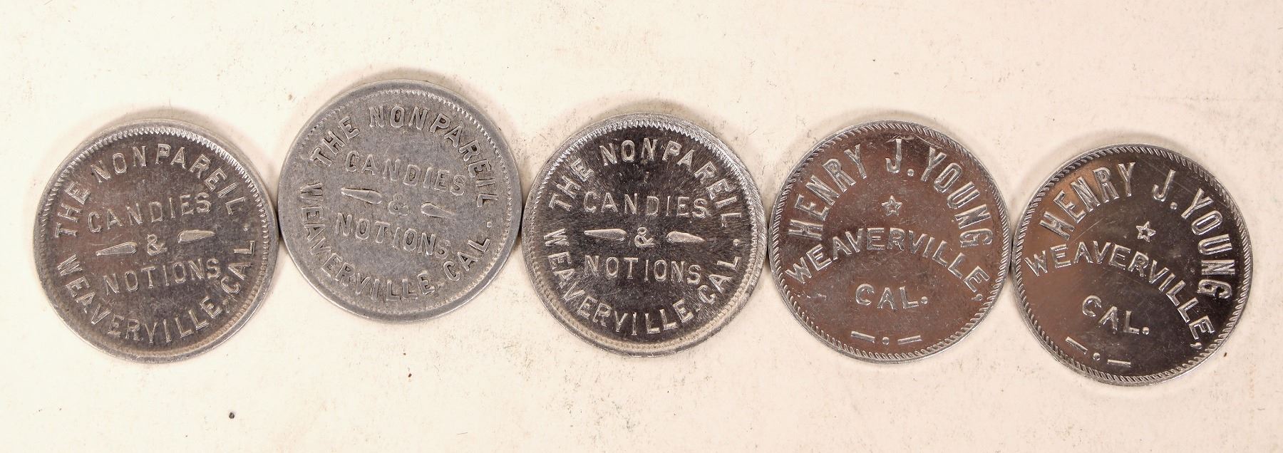 Five Weaverville tokens: three different denomination tokens from: THE NONPAREIL / CANDIES / & / NOTIONS / WEAVERVILLE CAL. // 5, 10, 12 1/2, cents. Al, rd, 24 mm. Two different: HENRY J. YOUNG / WEAVERVILLE, / CAL. // 25 (50) / CENTS. The Nonpareil was a candy store on Main Street near Court Street in 1903. Henry Young added a soda fountain in 1913 and was in business for many years._x000D_