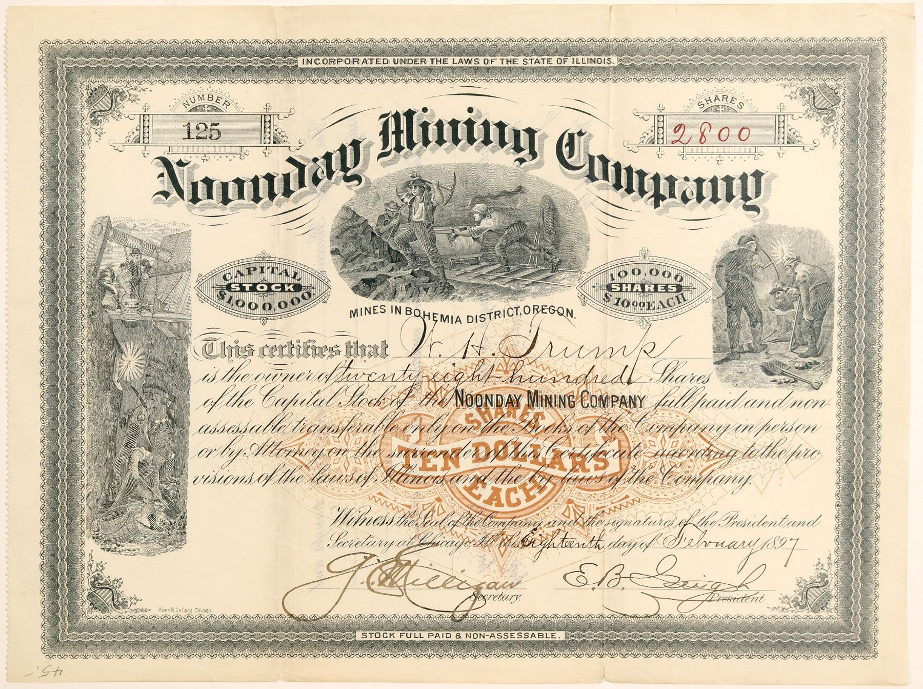 # 125 for 2,800 shares to WH Trump. Signed by Milligan and president EB Seigh. Dateline Chicago 1897. Three mining vignettes. Underprint 'Shares ten dollars each' with revenue imprint design. Keen & De Cang printer. Rips at fold edges. Some wrinkling. Brown revenue stamp design imprint gives this stock a nice look. "Noonday, owned by the Noonday Mining company, Herbert Leigh, Eugene, agent. This is one of the oldest properties in the district [Bohemian] and is generally spoken of as one of the best. It is idle at present because of litigation A 20 stamp mill constitutes the equipment. About 5,000 feet of workings reported. [Mining and Engineering World, Volume 23, 1905] Ken Prag Collection