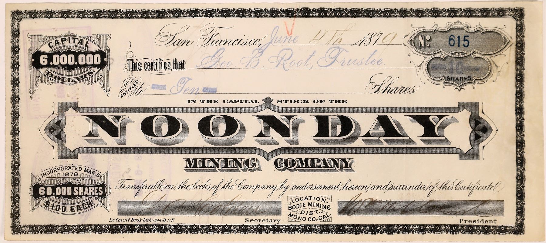 # 615 for 10 shares to George B Root trustee. Signed by Colder and president William Milligan. Dateline 1879 San Francisco. Incorporated Mar. 6, 1878. Not cancelled. No vignette. Le Count Bros. printer. Three assessment stamps on reverse. Many pin holes on left. No edge corner or discoloration issues. Location of Mine: Bodie Mining Dist., Mono Co., Cal. Located on Silver Hill along with the Dudley, Boston Con. and Last Chance. It was the third largest bullion producer at one time, behind the Standard and Bodie [Burchard, 1882]. Named after Noon Day!