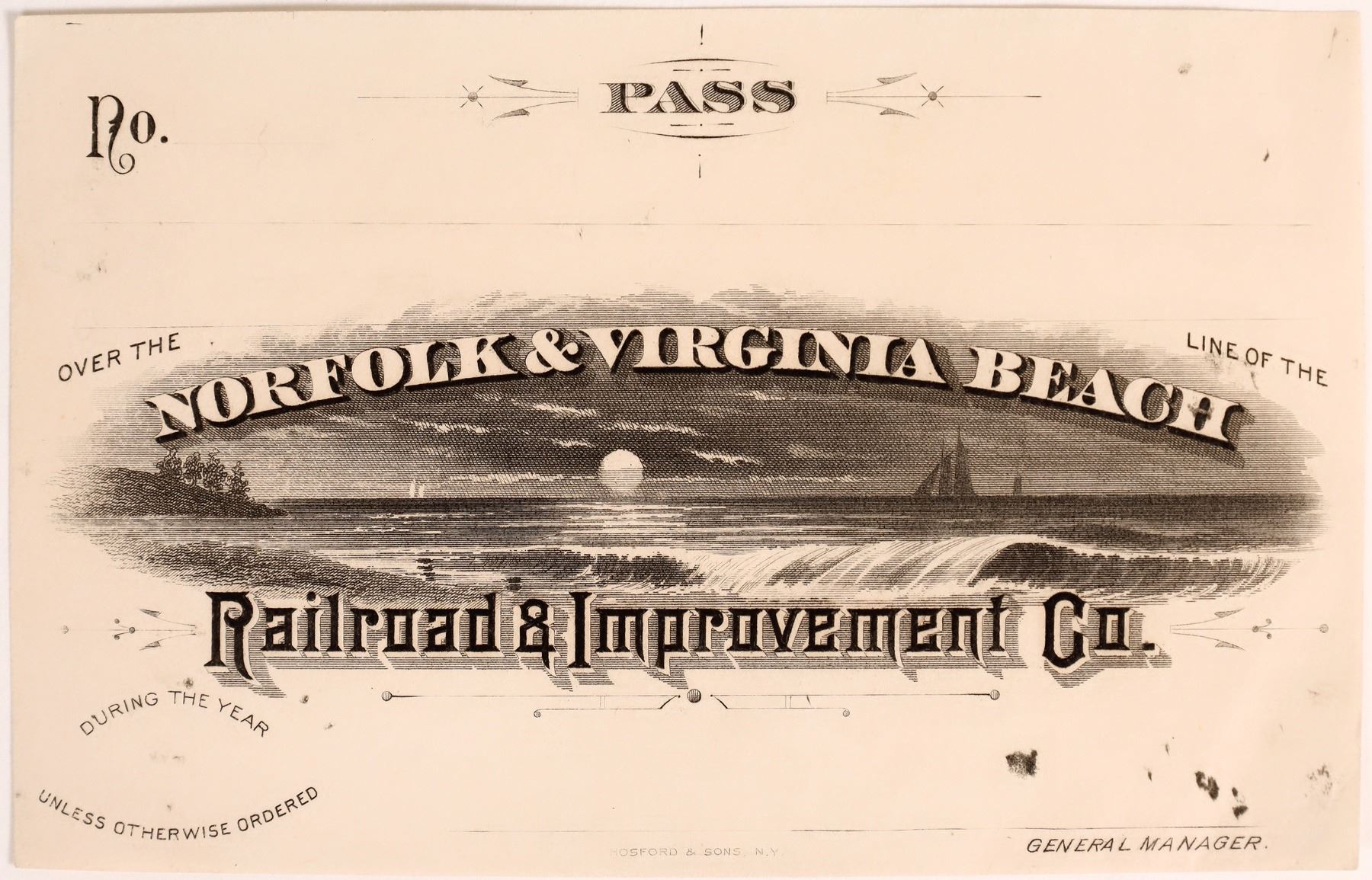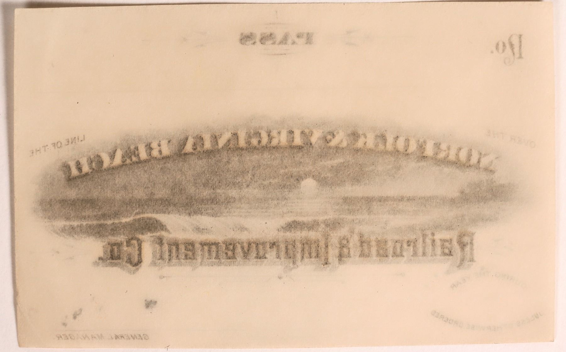 Proof pass printed on thin paper by Hosford & Sons, NY. Beautiful design with large vignette of the ocean at sunset. Began in 1883, to connect Norfolk with Virginia Beach. A narrow-gauge operation, it struggled nearly immediately, reorganizing as the Norfolk and Virginia Beach Railroad in 1887. In 1898, the line was converted to standard gauge, and the branch to Munden Point was built. In 1900, the line was merged into the Norfolk and Southern Railroad, itself merged into Southern Railway in 1974, and finally came under the ownership of the Norfolk Southern Railway in 1982.