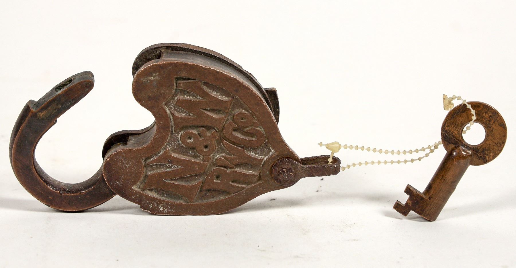 This elegant lock is embossed "N. & W Ry Co." on the front. The locking mechanism still works smoothly despite the touch of rust. See photo.