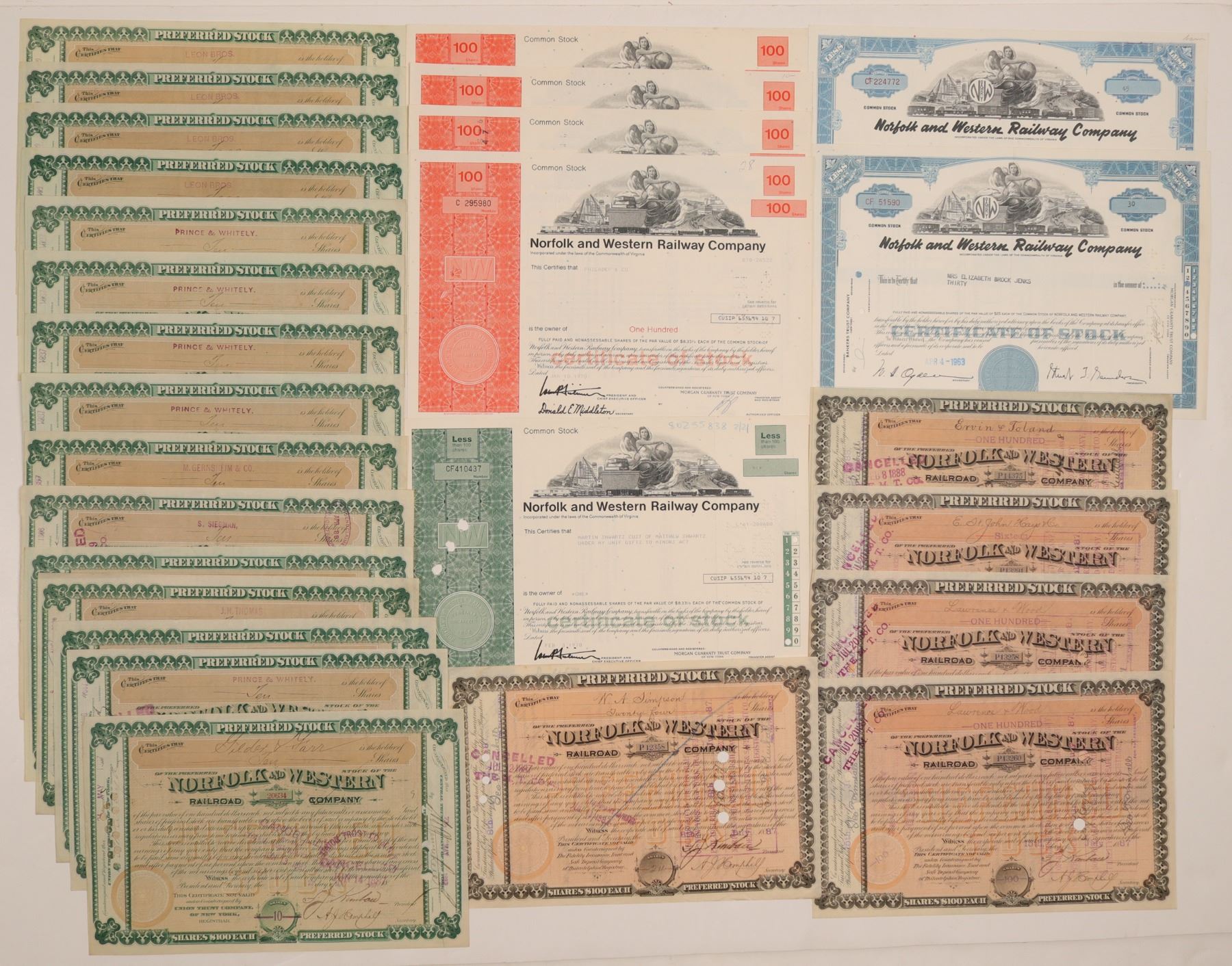 Lot of twenty-seven. Lot of 15 green 1880’s certs. Issued. Cancelled. Lot of five 1880’s brown certs. Issued. Cancelled. One green 1978 common stock with fancy vignette. Four orange 1977 common stocks with fancy vignette. Two blue Norfolk and Western Railway Company Stocks. 1863. Fancy vignette. City: State: Virginia Date: 1886-1978