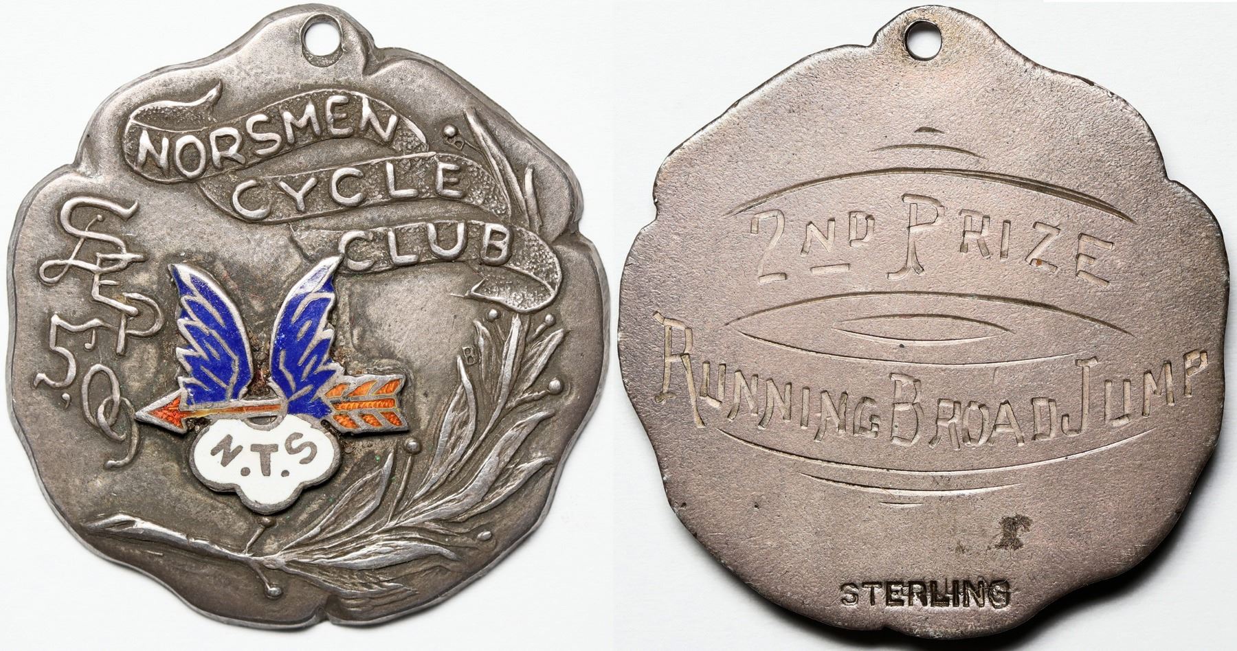 Ornate sterling silver medal with raised lettering that reads, "NORSMEN CYCLE CLUB," "SEP 5, 09," and engraved on back, "2ND PRIZE RUNNING BROAD JUMP." Approx. 1-1/4 inch diameter medal has the sterling stamp on reverse, and blue and red enamel wings with an arrow and acronym, "N.T.S." on the front, and a hole for attaching to a chain. See photo for more details.