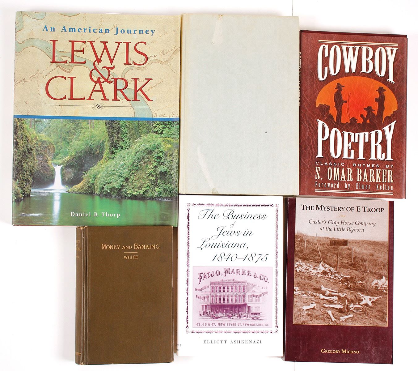 6 hardcovers. Money and Banking by White, The Mystery of E Troop by Michno, Cowboy Poetry by Barker, The Business of Jews in Louisiana 1840-1875 by Ashkenazi, Panama Canal by Martinez, Lewis and Clark by Thorp Date: Location: HWAC# 63958