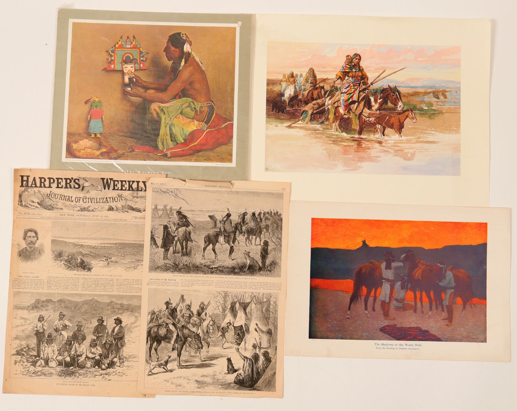 5 pieces in this lot: The Kachina Doll 12" x 10", copyright 1963, The Atchison, Topeka and Santa Fe Railway Company Litho in U.S.A; The Shadow at the Water Hole; 8.5" x 12.5"; Harpers Weekly a Journal of Civilization; June 14,m 1873; Harper's Weekly "Young Bucks Returning with Spoils"; Squaw Travois by Charles M. Russell, by Penn Prints, New York. Ready to frame. Brian Thaler Collection