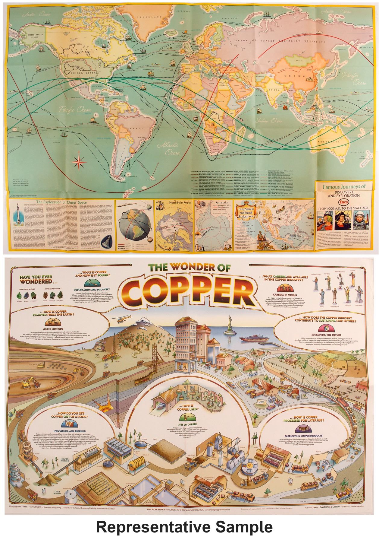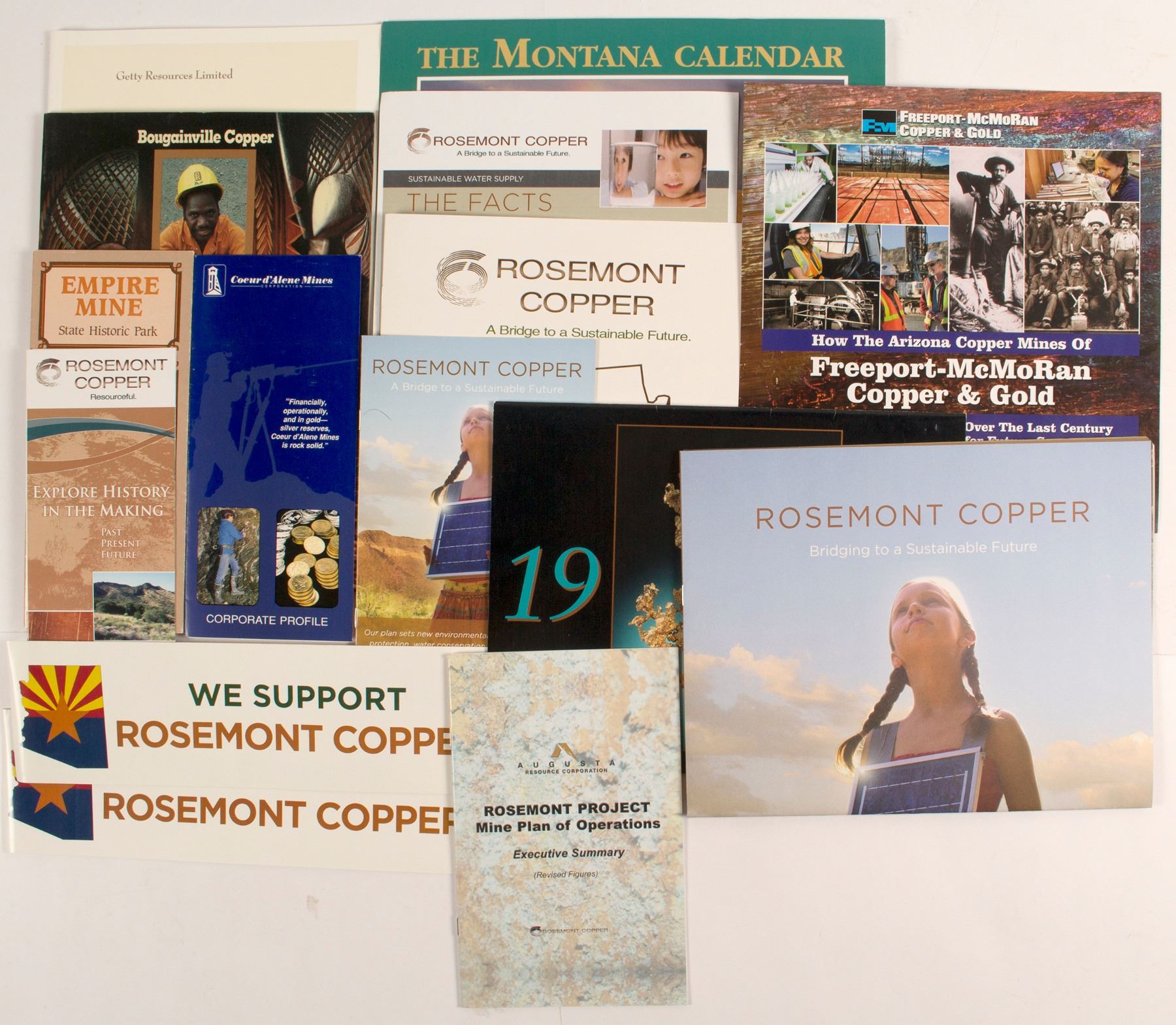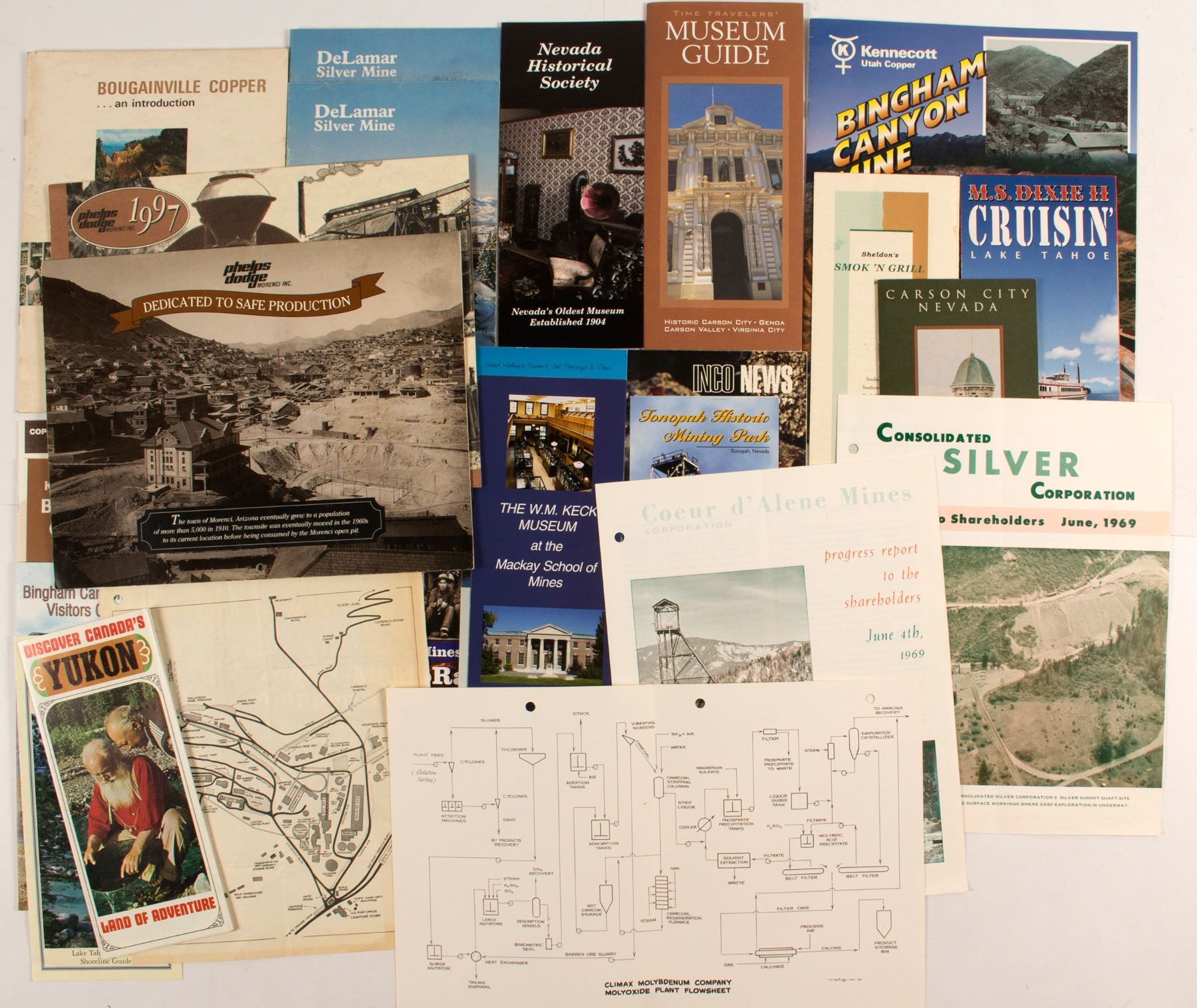 Late 20th century color promo booklets from the Yukon Canada, Tonopah, NV, Carson City, NV, Lake Tahoe, DeLamar Silver Mine, Empire Mine, Ca , Bogainville Copper and more. 2000 Montana Calendar. 1992 and 1997 Phelps Dodge Western themed calendar. 1996 Phelps Dodge mineral themed calendar. ENCO world map. A packet of Rosemont Copper brochures. Several other mine related brochures.
