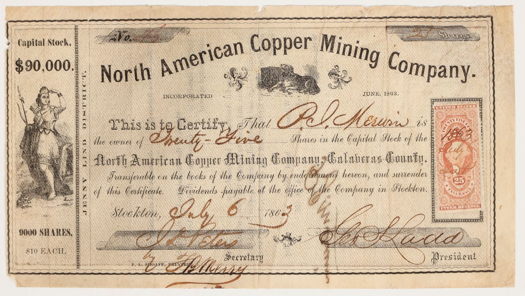 "Jenny Lind District" printed on left. Inc. June 1863. Issued in July 1863 to PI Merwin. Signed by president Geo. Ladd and the secretary. Not cancelled. Allegorical vignette. 25 cent revenue stamp on the right. Folds, creases, tape repairs. Located some 15 miles southwest of San Andreas in the Jenny Lind District, Calaveras County.