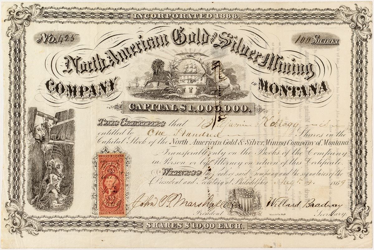 Very early Montana mining piece. Inc. 1866. No. 425, issued in Philadelphia, where much of the early Montana financing was coming from. 100 shares to Benjamin Kellogg on Aug. 4, 1869. Signed by John Marshall (vice president) and Willard Bradway (secretary). Not cancelled. Great mining vignette showing miners with headlamp and ore bucket. Allegorical vignette at top. Printed by Moses & Co., Philadelphia. 25 cent adhesive revenue stamp with pen cancel. 7.75" x 11.5" Folds and light wear. Difficult to locate additional information on the company. Possibly out of Helena. City: State: Montana Date: ID: 36645