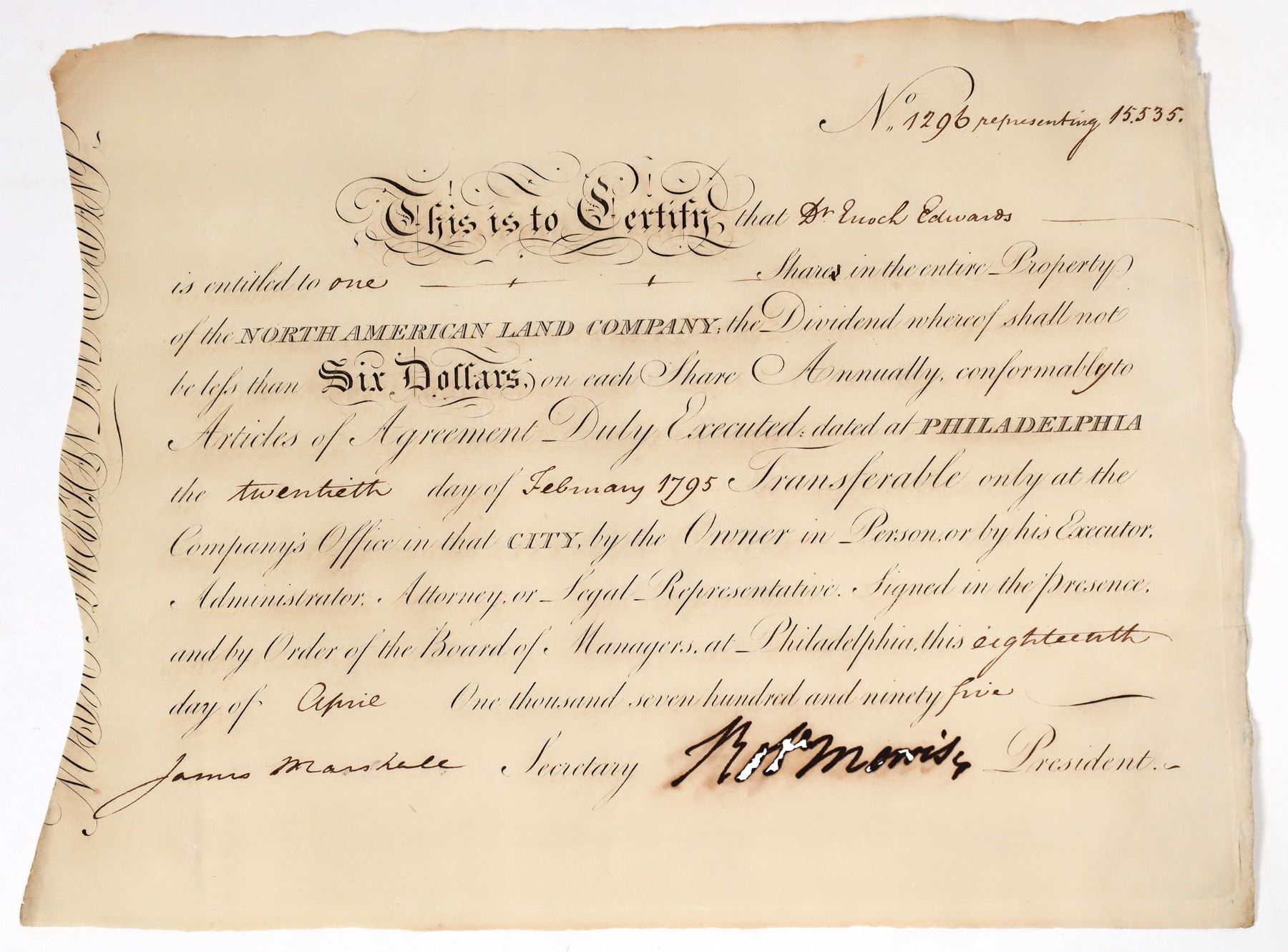 Certificate 1296 issued to Dr. Enoch Edwards for 1 share of the North American Land Company, 1795. Not cancelled. "Enoch Edwards was an American physician and a leading Patriot during the American Revolution. Born in Byberry Township, Pennsylvania, Edwards was a member of the Provincial Congress in Carpenters' Hall on June 18, 1776, which led to the Pennsylvania Constitution of 1776" from Wikipedia. Robert Morris, in addition to being a signer of the Declaration of Independence, was called the "financier of the American Revolution." But his involvement with the North American Land Company literally destroyed his life. During the Revolutionary War Morris, an extremely wealthy Philadelphian, kept his friend George Washington and his troops fed, clothed, and armed. After the war Morris tried his hands in other ventures including the largest land trust in American History and is one of the first publicly traded Real Estate companies. To make a long story short, his investments turned bad and the harder he tried to reverse his fortunes the deeper in debt he became. So, in 1798 the financier of the American Revolution and signer of the Declaration of Independence found himself in debtors prison! James Marshall (brother of Chief Justice John Marshall) was his son-in-law and made a valiant but unsuccessful trip to Europe to gain supporters.
