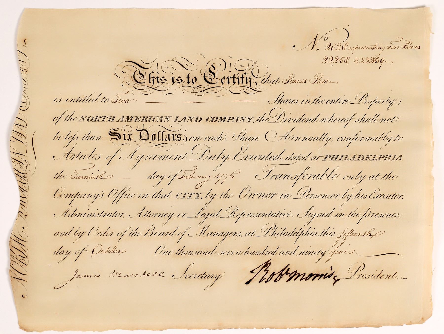 Rare uncancelled signature! Issued to James Rees for two shares in 1795. Signed by Robert Morris as president and James Marshall as secretary. The Morris signature is not cancelled (normally they are pen cancelled). 9.5 x 12" Some toning, rough edges. We could not locate any information about James Rees. Robert Morris was called the "financier of the American Revolution" and was one of the signers of the Declaration of Independence, founder of the Bank of North America, delegate to the Constitutional Convention, and member of the first Senate of the United States. But his involvement with the North American Land Company literally destroyed his life. During the Revolutionary War, Morris, an extremely wealthy Philadelphian, kept his friend George Washington and his troops fed, clothed, and armed. After the war Morris tried his hands in other ventures including the largest land trust in American History, and is one of the first publicly traded Real Estate companies. To make a long story short, his investments turned bad and the harder he tried to reverse his fortunes the deeper in debt he became. So in 1798 the financier of the American Revolution and signer of the Declaration of Independence found himself in debtors prison! James Marshall (brother of Chief Justice John Marshall) was his son-in-law and made a valiant but unsuccessful trip to Europe to gain supporters.