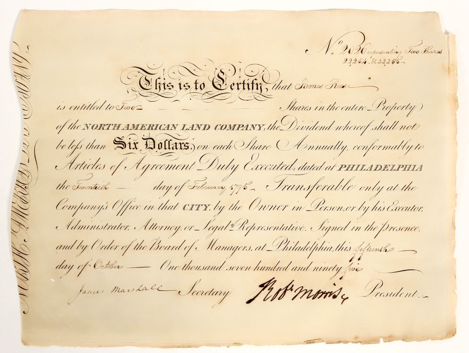 North American Land Co. stock issued to James Rees in 1795. Signed by Robert Morris as president and James Marshall as secretary. Morris' signature is not cancelled! 9.75 x 12" Robert Morris was the financier of the American Revolution, and one of only two Founding Fathers to sign all three key American documents: The Declaration of Independence, the Constitution, and the Articles of Confederation. Morris was the first to use the dollar sign in official documents. But his involvement with the North American Land Company literally destroyed his life. During the Revolutionary War, Morris, an extremely wealthy Philadelphian, kept his friend George Washington and his troops fed, clothed, and armed. After the war Morris tried his hands in other ventures including the largest land trust in American History, and is one of the first publicly traded Real Estate companies. To make a long story short, his investments turned bad and the harder he tried to reverse his fortunes the deeper in debt he became. So in 1798 the financier of the American Revolution and signer of the Declaration of Independence found himself in debtors prison! The financial Panic of 1796 led to his financial ruin and he was incarcerated for debt in the Prune Street Prison. James Marshall (brother of Chief Justice John Marshall) was his son-in-law and made a valiant but unsuccessful trip to Europe to gain supporters. We could not locate any information about James Rees.