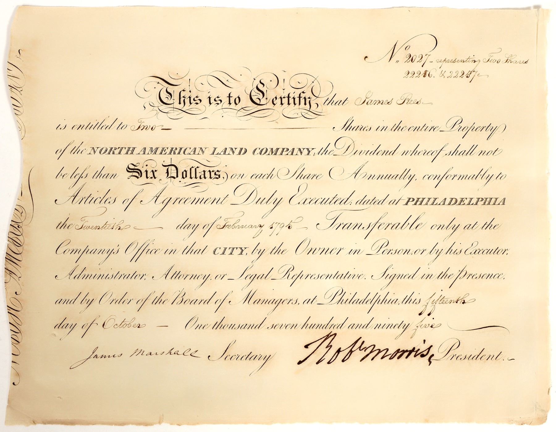 North American Land Co. stock issued to James Rees in 1795. Signed by Robert Morris as president and James Marshall as secretary. Morris' signature is not cancelled! 9.75 x 12" Robert Morris was the financier of the American Revolution, and one of only two Founding Fathers to sign all three key American documents: The Declaration of Independence, the Constitution, and the Articles of Confederation. Morris was the first to use the dollar sign in official documents. But his involvement with the North American Land Company literally destroyed his life. During the Revolutionary War, Morris, an extremely wealthy Philadelphian, kept his friend George Washington and his troops fed, clothed, and armed. After the war Morris tried his hands in other ventures including the largest land trust in American History, and is one of the first publicly traded Real Estate companies. To make a long story short, his investments turned bad and the harder he tried to reverse his fortunes the deeper in debt he became. So in 1798 the financier of the American Revolution and signer of the Declaration of Independence found himself in debtors prison! The financial Panic of 1796 led to his financial ruin and he was incarcerated for debt in the Prune Street Prison. James Marshall (brother of Chief Justice John Marshall) was his son-in-law and made a valiant but unsuccessful trip to Europe to gain supporters. We could not locate any information about James Rees.