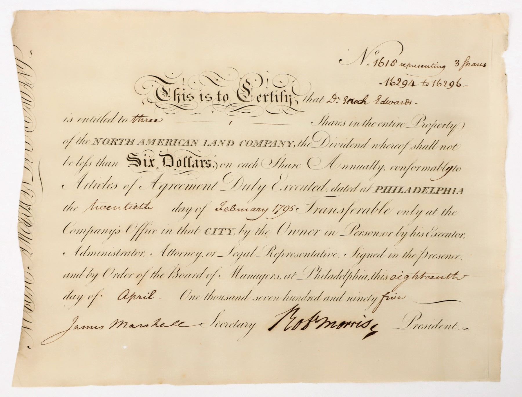 North American Land Company stock issued in 1795 to Dr. Enoch Edwards, who was the personal surgeon of George Washington. Signed by Robert Morris as president and James Marshall as secretary. Not cancelled! Robert Morris was the financier of the American Revolution, and one of only two Founding Fathers to sign all three key American documents: The Declaration of Independence, the Constitution, and the Articles of Confederation. Morris was the first to use the dollar sign in official documents. The financial Panic of 1796 led to his financial ruin and he was incarcerated for debt in the Prune Street Prison.