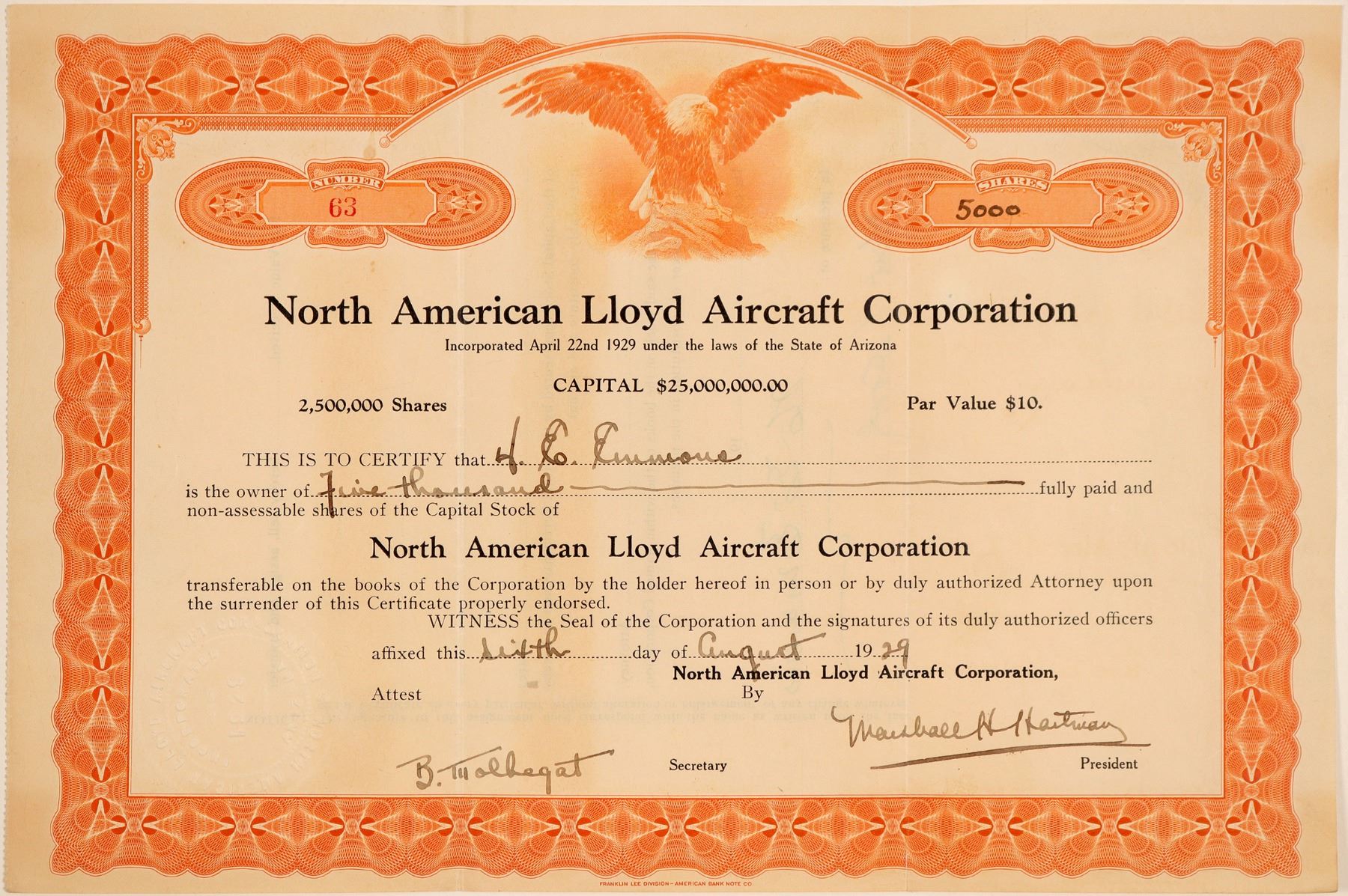 Inc. in Arizona. No. 63, issued for 5,000 shares to H.E. Emmons on August 6th, 1929. Signed by secretary B. Tholbegat and president Marshall Hartman. Not cancelled. Orange border, black print, eagle vignette. Heavy folds, toning. 8 x 12" According to the Iron Age, Vol. 124, the company planned to build an airport at Jamestown, NY in 1929. Ken Prag Collection