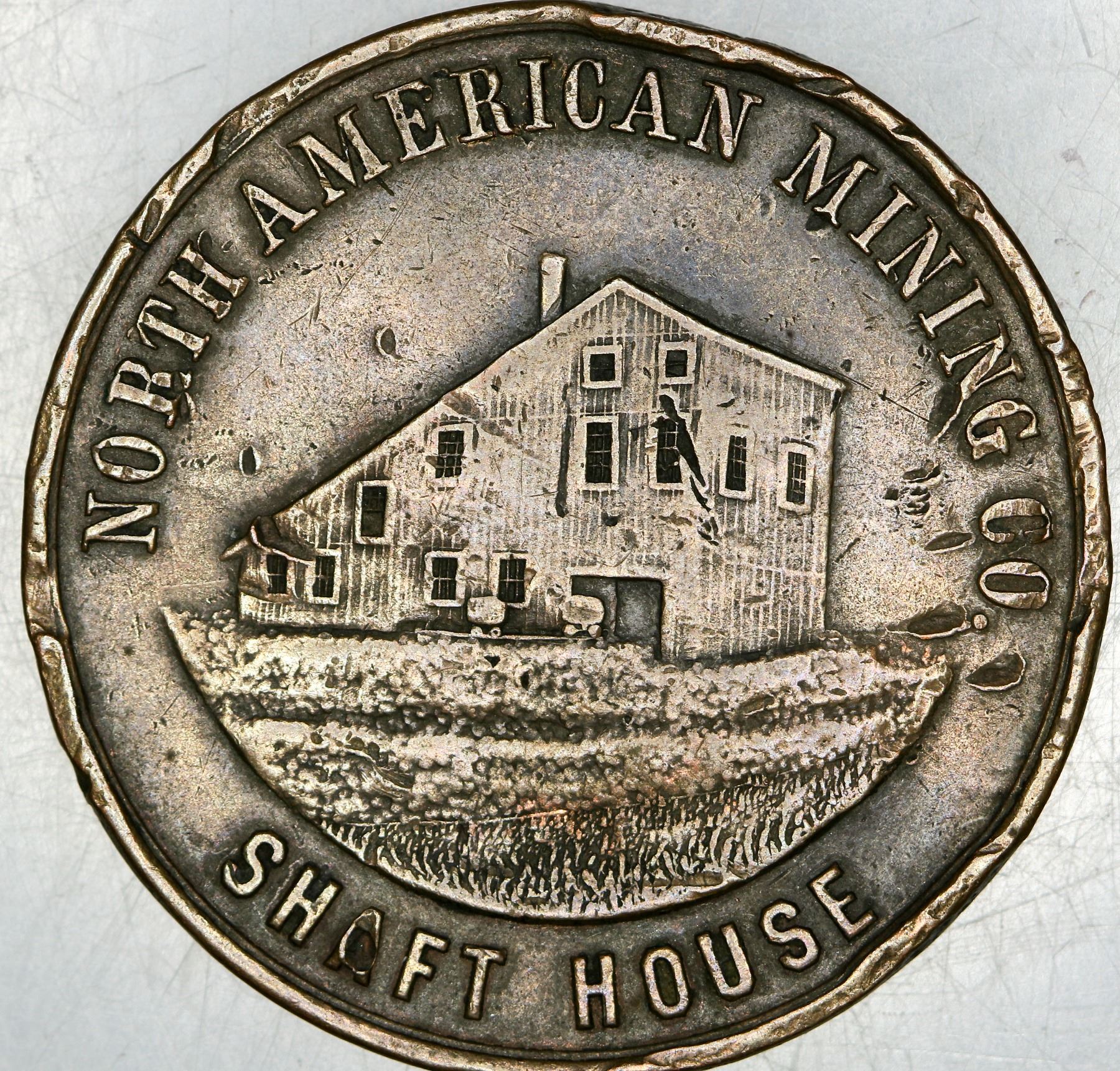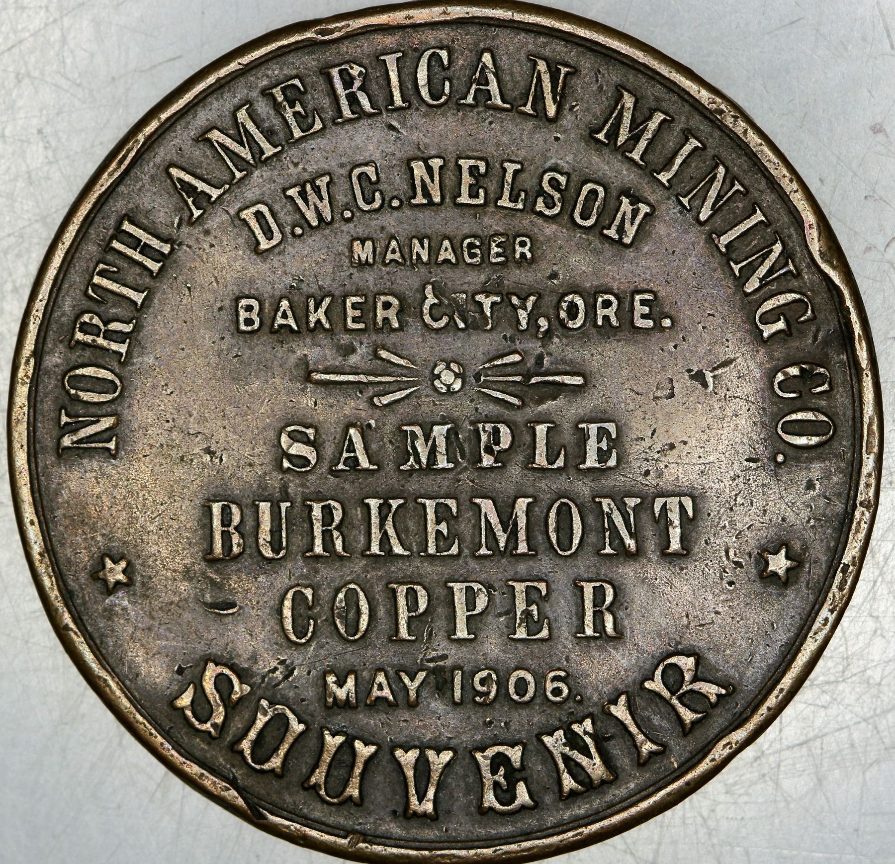 Medal reads "North American Mining Company / (large building) / Shaft House // North American Mining Co. / D. W. C. Nelson / Manager / Baker City, Ore. / Sample / Burkemont / Copper / May 1906 / Souvenir." Copper, 38mm, hard to grade but perhaps F, unlisted in H&K. Included copy of a photograph held by the Baker County Library shows the same exact shaft house at Burkemont, Baker Co., Oregon.