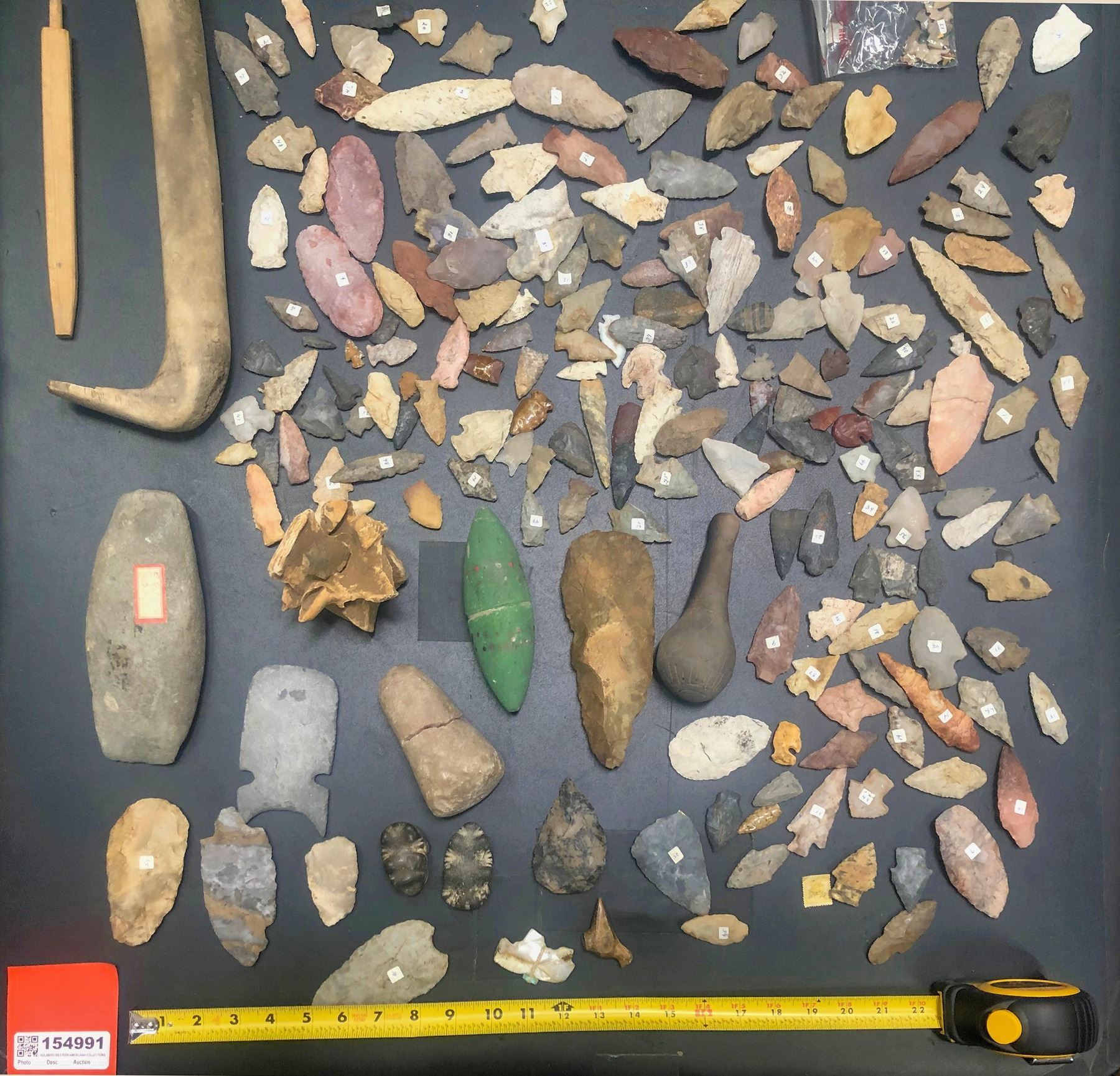 Large collection of Native American projectile points, numbering about 130-150 points. Each is numbered with a corresponding inventory that may or may not be correct. The source material for most appears Mississippi Valley region. A dark fired clay piece is of interest, source unknown. There are two faux objects, a painted green hammer of sorts and a vertebrae with a real arrowhead imbedded into the bone. Here, the hole in the bone is clearly hand carved, not a product of impact.