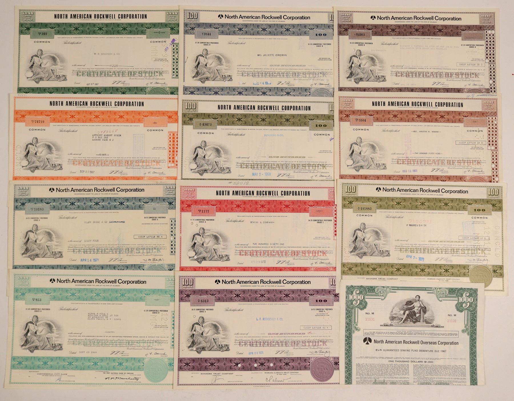 Lot of 12 (eleven stocks and one bond). Pittsburgh-based Rockwell Standard acquired and merged with Los Angeles-based North American Aviation to form North American Rockwell in September 1967. In the 1980s, it became the largest U.S. defense contractor and largest NASA contractor. Stocks issued 1967-1972, punch cancelled. $1,000 Bond issued in 1972, punch cancelled. Ken Prag Collection