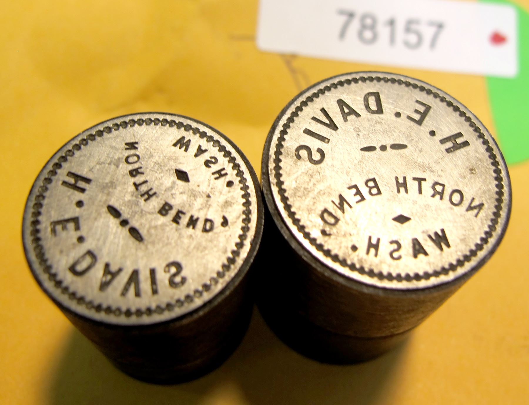 2 token dies self identified from North Bend, WA. 21mm: HE Davis. 24mm: HE Davis. Northwest Territorial Mint Historical Token Die Collection State: Washington City: North Bend Date: c1903-1950 HWAC# 78157