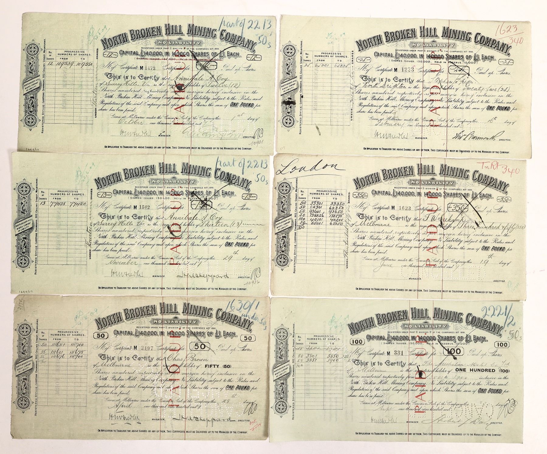 Lot of 6 stocks issued 1905-1909. All punch cancelled and marked "Paid." Black print on green paper. 7 x 12.5" Famous Australian mining company! Broken Hill, 1100 km west of Sydney, is Australia's longest lived mining city. Silver ore was discovered at Broken Hill in 1883. The company was formed in 1888 as North Broken Hill Silver Mining to exploit the rich silver, lead and zinc deposits at Broken Hill in western New South Wales. The name was shortened to North Broken Hill in 1905. Production at the original North Broken Hill mine wound down and it finally closed in 1993. Australia Broken Hill 1905-1909