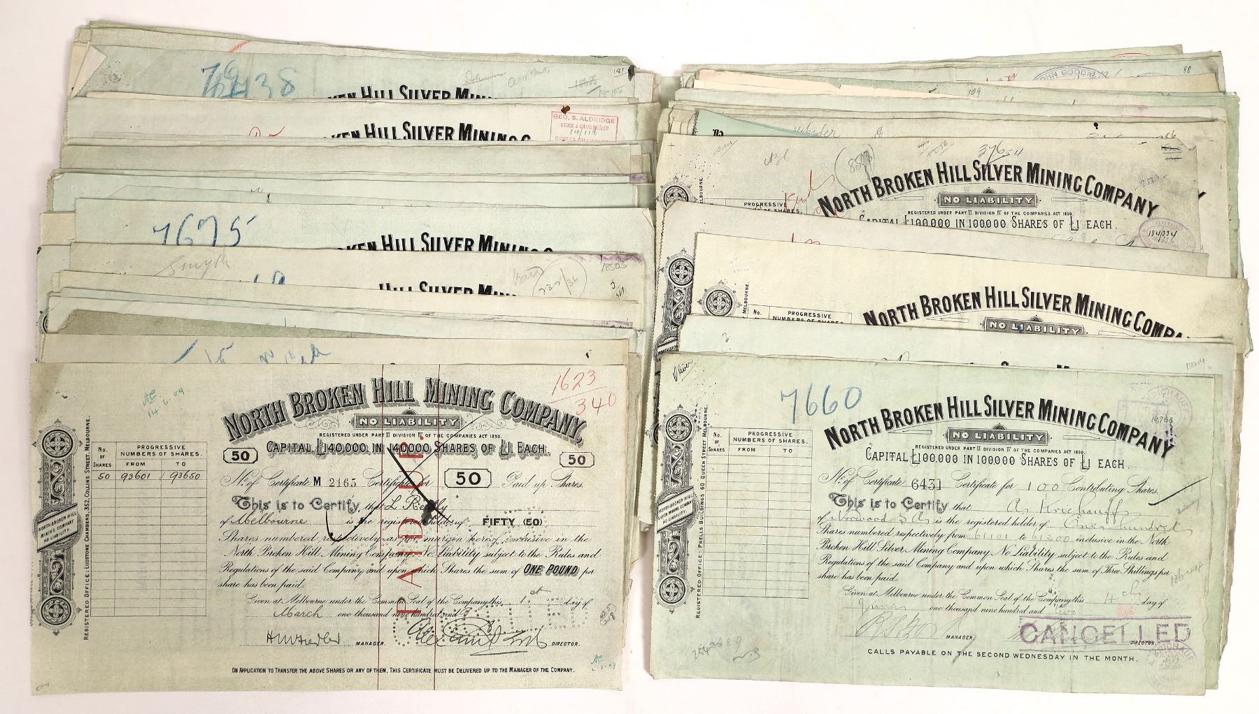 Lot of 100+. All but one are "North Broken Hill Silver Mining Company," 50 and 100 shares, issued 1900-04. One is for the later name, "North Broken Hill Mining Company," issued in 1909, 50 shares. All cancelled. Black print on green paper. Famous Australian mining company! Broken Hill, 1100 km west of Sydney, is Australia's longest lived mining city. Silver ore was discovered at Broken Hill in 1883. The company was formed in 1888 as North Broken Hill Silver Mining to exploit the rich silver, lead and zinc deposits at Broken Hill in western New South Wales. The name was shortened to North Broken Hill in 1905. Production at the original North Broken Hill mine wound down and it finally closed in 1993. Broken Hill Australia