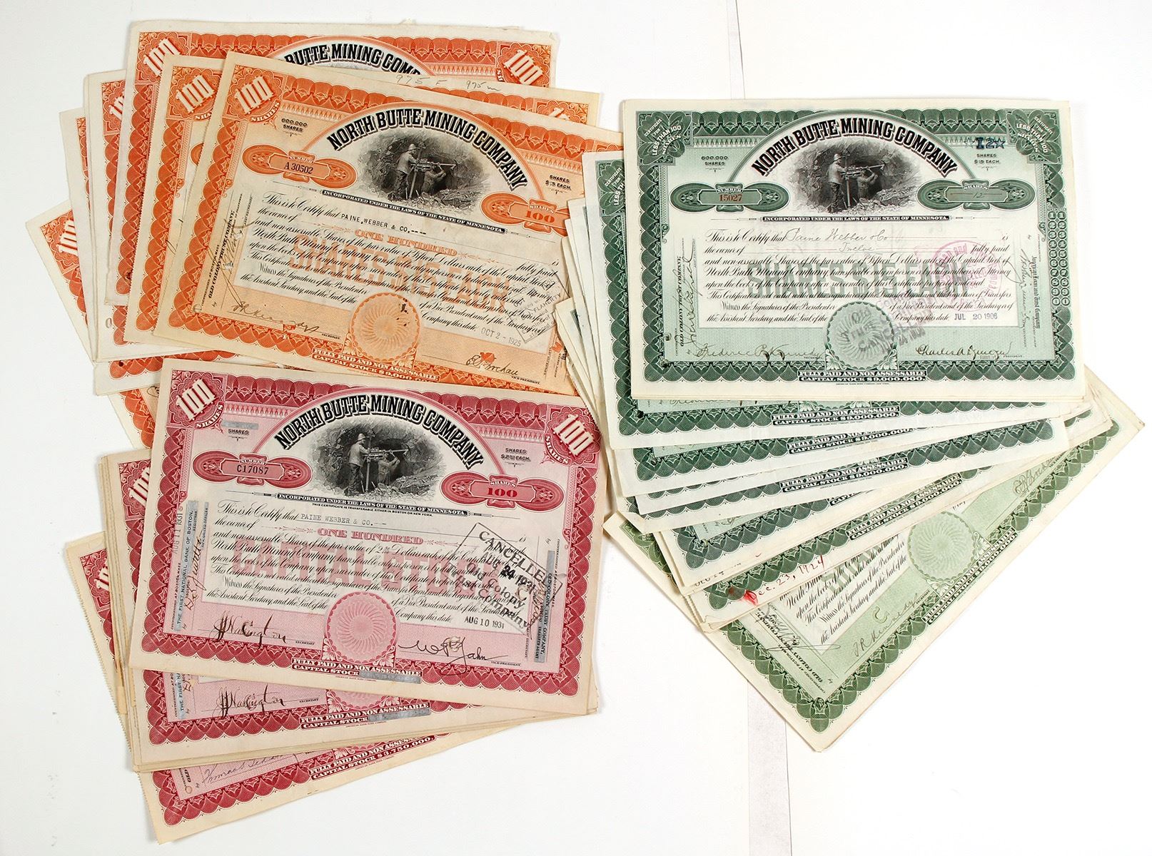 Stock Certs. I/C (some punch cancelled) vignette of miner working, orange, pink & green colors. Mostly 100 shares a few 50 & 35. Date: early 1900's Location: Butte, Montana HWAC# 63961