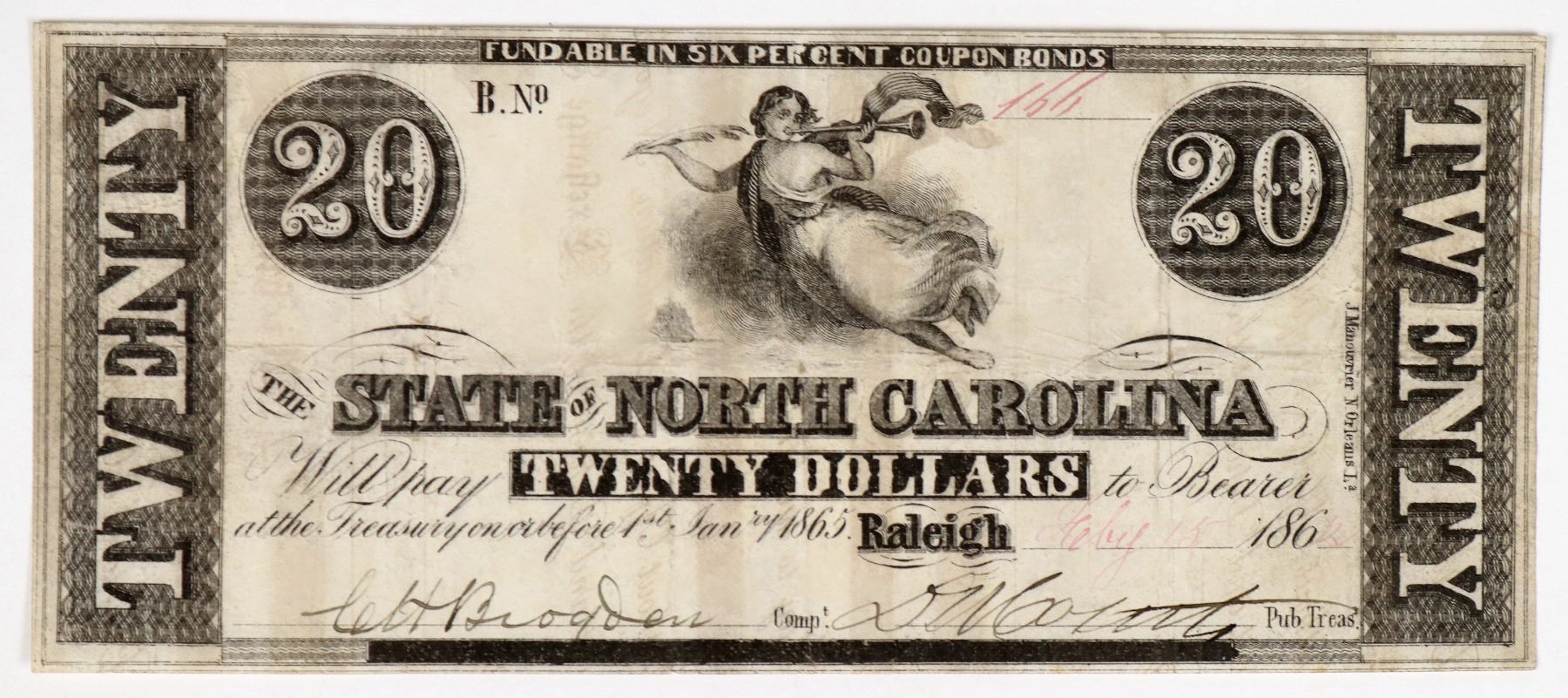 North Carolina Criswell 77, 1862 obsolete banknote. Richmond second of exchange on verso. VF condition. [Raleigh] [North Carolina] [] [] []