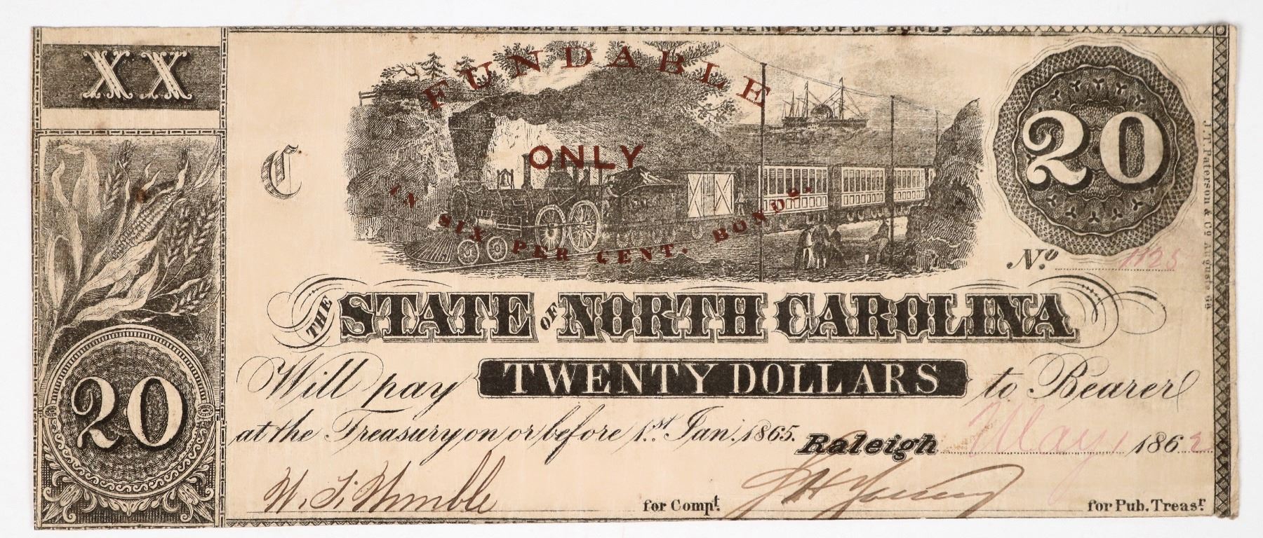 North Carolina Criswell 8a, 1862 $20 banknote with born overprint "Fundable only in six percent bonds". VF condition with a few brown spots. [Raleigh] [North Carolina] [] [] []