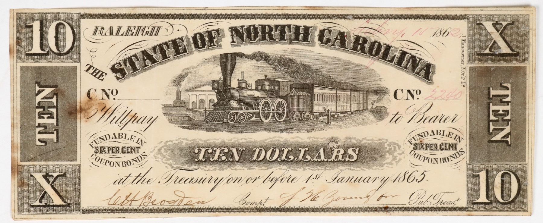 North Carolina Criswell 82, 1865 $10 obsolete banknote. Choice VF+ condition with some left side toning. [Raleigh] [North Carolina] [] [] []