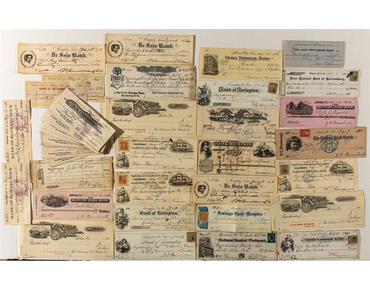 Lot of 65. Many pictorial. Some have adhesive revenues. Includes checks from: Blowing Rock (NC), Memphis, Piedmont, Asheville, Richmond, Salem (VA), Belington, Harrisonburg, Johnson City, Lexington, and Lake Providence (LA). Fair to good condition. Please inspect! (Prag Collection)