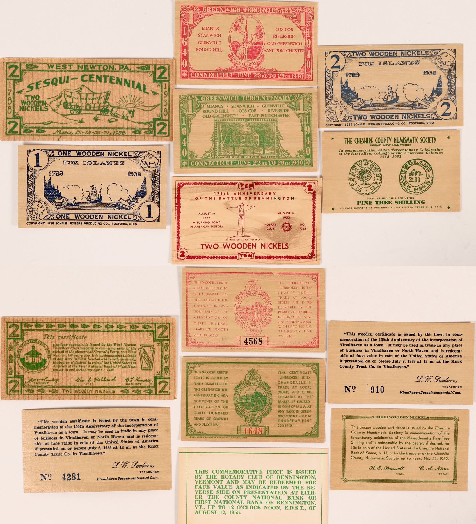 7 total. 1. The Cheshire County Numismatic Society , Pine Tree Schilling, 1953 Tercentenary Celebration First Silver Coinage. Green. Reverse statement of redemption.