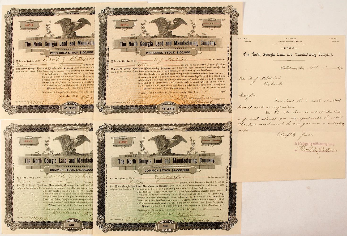 Lot of five. 1) Number 4471 issued to David J Whiteford for 10 shares. Signed by secretary CN Fox, treasurer OF Sampson and president WH Kimball. Large vignette of an eagle. 2) 4884 issued to DJ Whiteford. 3) 4862 issued to DJ Whiteford. This stock has a green background. 4) 4471 issued to Whiteford. Also in green. 5) 1893 letterhead. Addressed to Whiteford about stocks he has purchased and transferred. Assuredly some (or all) of the stocks in this lot. All stocks are uncancelled and in very nice condition. Two vertical folds on each. This company had a furnace built in 1890 for the production of pig iron. It replaced the defunct and mis-managed Georgia-Alabama Investment and Development Company. [Engineering and Mining Journal, Volume 56] This new company didn't seem to fair much better. From 1893 to 1897 there didn't seem to be any production. with these two companies, Tallapoosa's attempts as a manufacturing center seemed to have died. [Tallapoosa Commercial Historic District application for National Register of Historic Places] (Al Adams Gold Rush Memorabilia Collection) Date: 1893 Location: Tallapoosa, Georgia HWAC# 57318