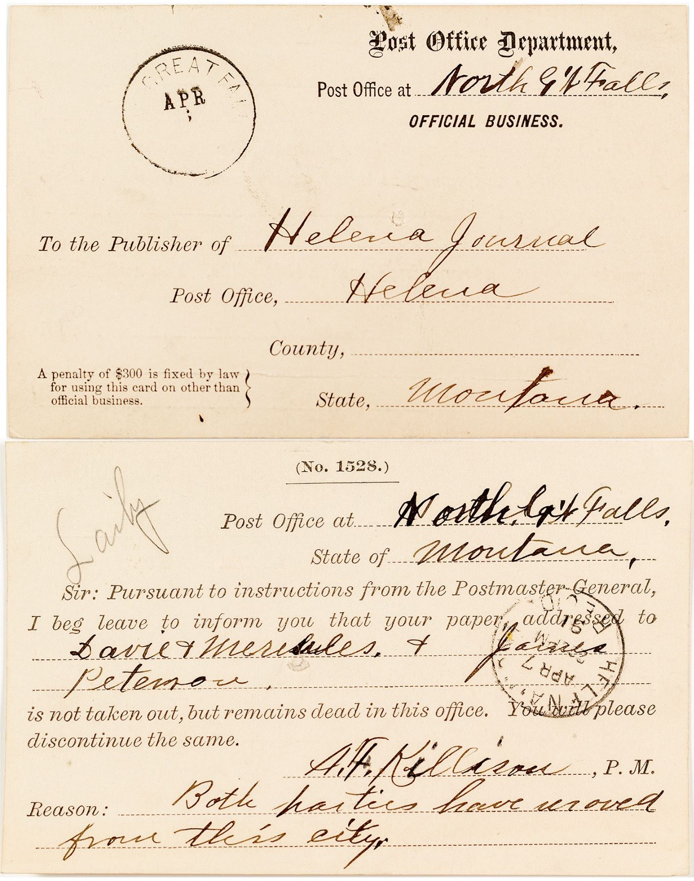 North Great Falls official postcard from Cascade CO MT. Post office ran from 1890-1893. Very rare postmark. "North" is not visible in the black circle cancel. State: Montana City: North Great Falls HWAC#: 38577 Date: