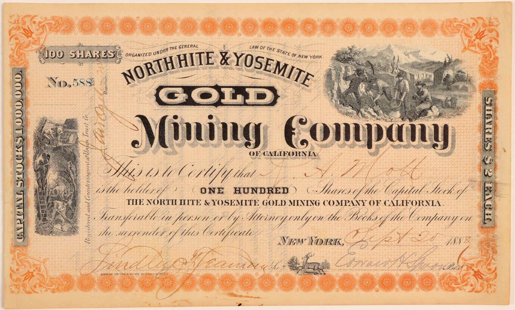 Inc. in New York. No. 588, issued for 100 shares to RA Mott on Sept. 20th, 1880 in New York. Signed by president Edward H Spooner and secretary Lindley Teaman. Not cancelled. Orange border and background, black print and two vignettes of placer and underground mining. Lith. of Snyder & Black, NY. Folds, heavy toning. 7 x 11" John R. Hite discovered gold at this location in 1862, and the ore was initially processed with arastras until a mill was constructed in 1866. A twenty stamp mill was in place by 1874, and by 1888 a 40-stamp mill was operating. Total production from the property was estimated at $3 million. From the Engineering and Mining Journal, Vol. XXX, #1 (July 3, 1880), p. 114: "The agent of this company telegraphed on the 4th inst. as follows, "Surveyor commenced making his surveys on the 2nd. We shall have extracted by the 7th of September about 1200 tons of ore, which will mill $20 per ton." City: Yosemite State: California Date: 1880