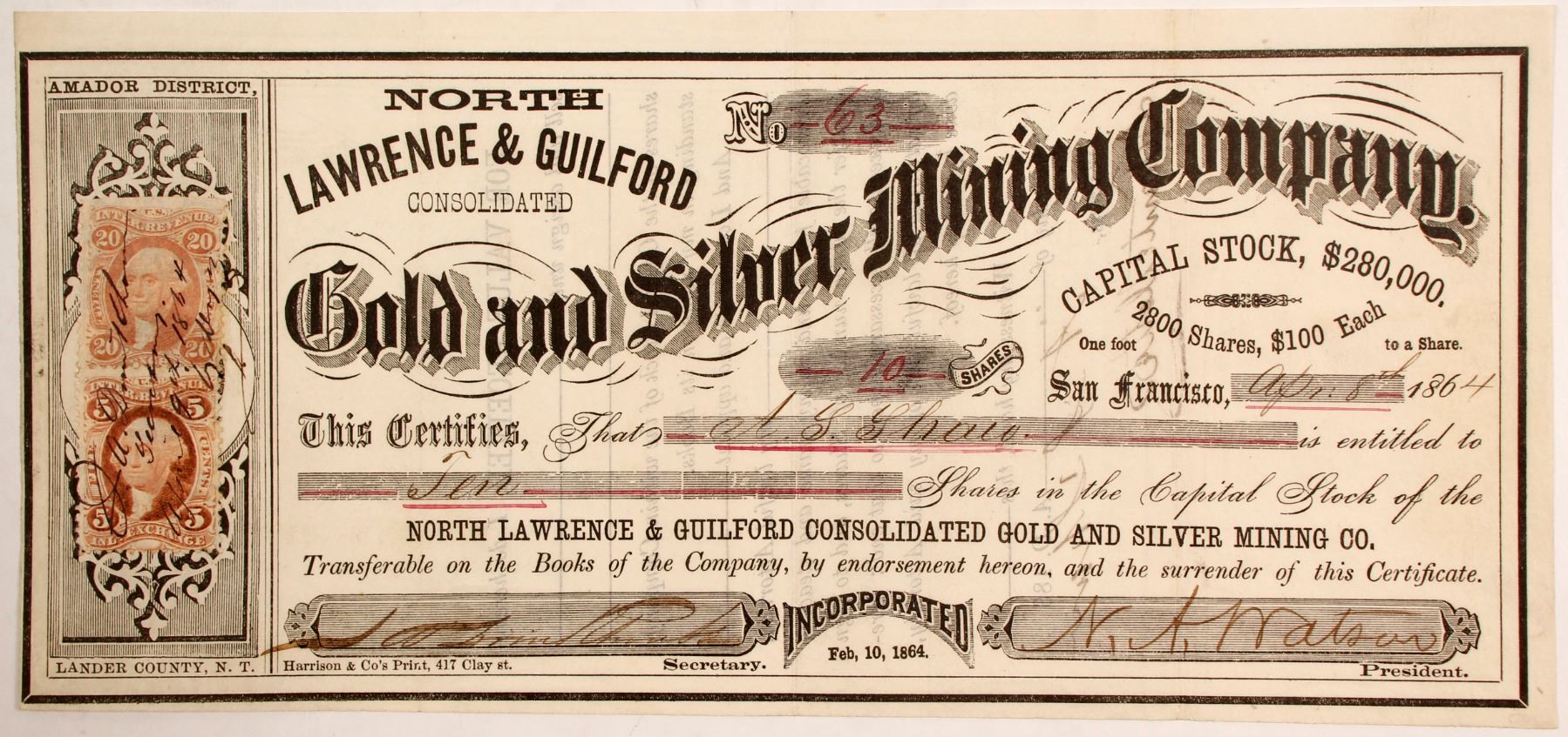 #63 for 10 shares to AL Shaw. Signed by NA Watson as president and secretary (?). Dateline San Francisco 1864. Incorporated Feb. 10, 1864. Not cancelled. Small 5c and 20c revenue stamps. Location: Amador District, Lander County, N. T. Printed by Harrison & Co. One foot to a share. Vertical folds. No edge, corner, pinhole or discoloration issues. The Amador Mining District was 6 miles north of Austin around New York Canyon. It was later incorporated into the Reese River District. [Mining Districts of Nevada by Tingley] Prag Collection State: Nevada City: Amador Mining District Date: 1864 HWAC# 84563