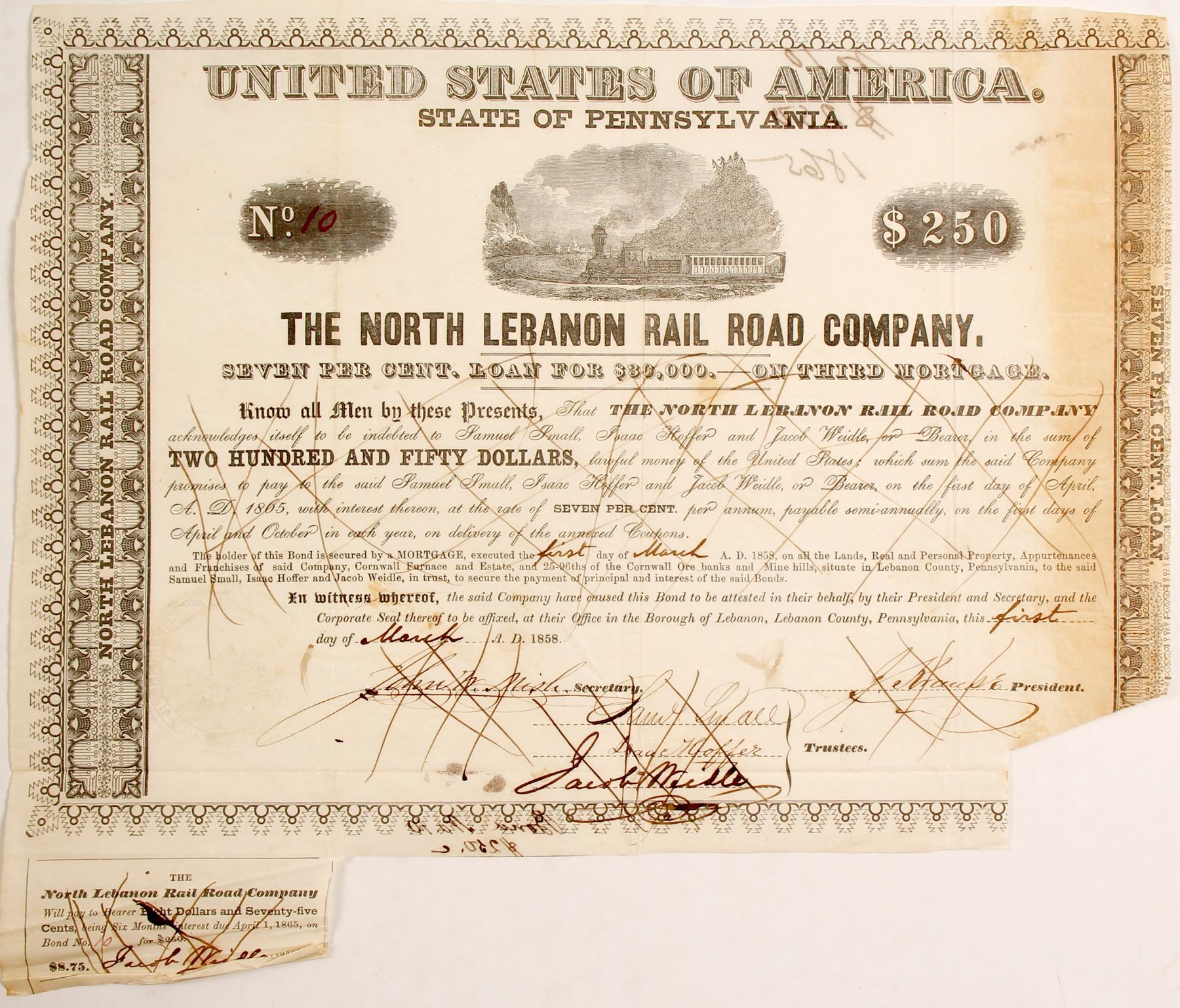 I/C #10 $250 1858. Signed by President Illegible. Train vignette. corner missing, toning, pen cancel, rear ink bleed thru. Please inspect, sold as is. Prag Collection. Pennsylvania