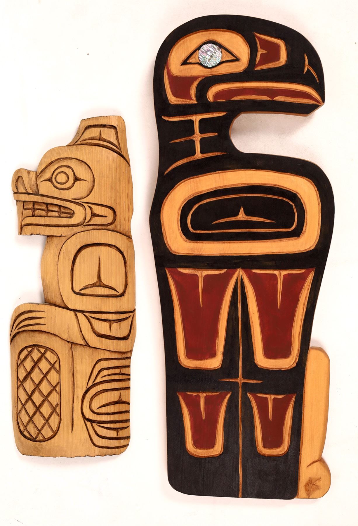 This lot of two north Pacific coast wood carvings are from the Squamish Nation of British Columbia, the beaver signed by Sean Moody the artist at 11 in. tall. The second wood carving is of the eagle; carved and painted by J. Vonda. The eagle has an abalone eye, 15 in tall. Please see photo for details. State: City: Date: Provenance: