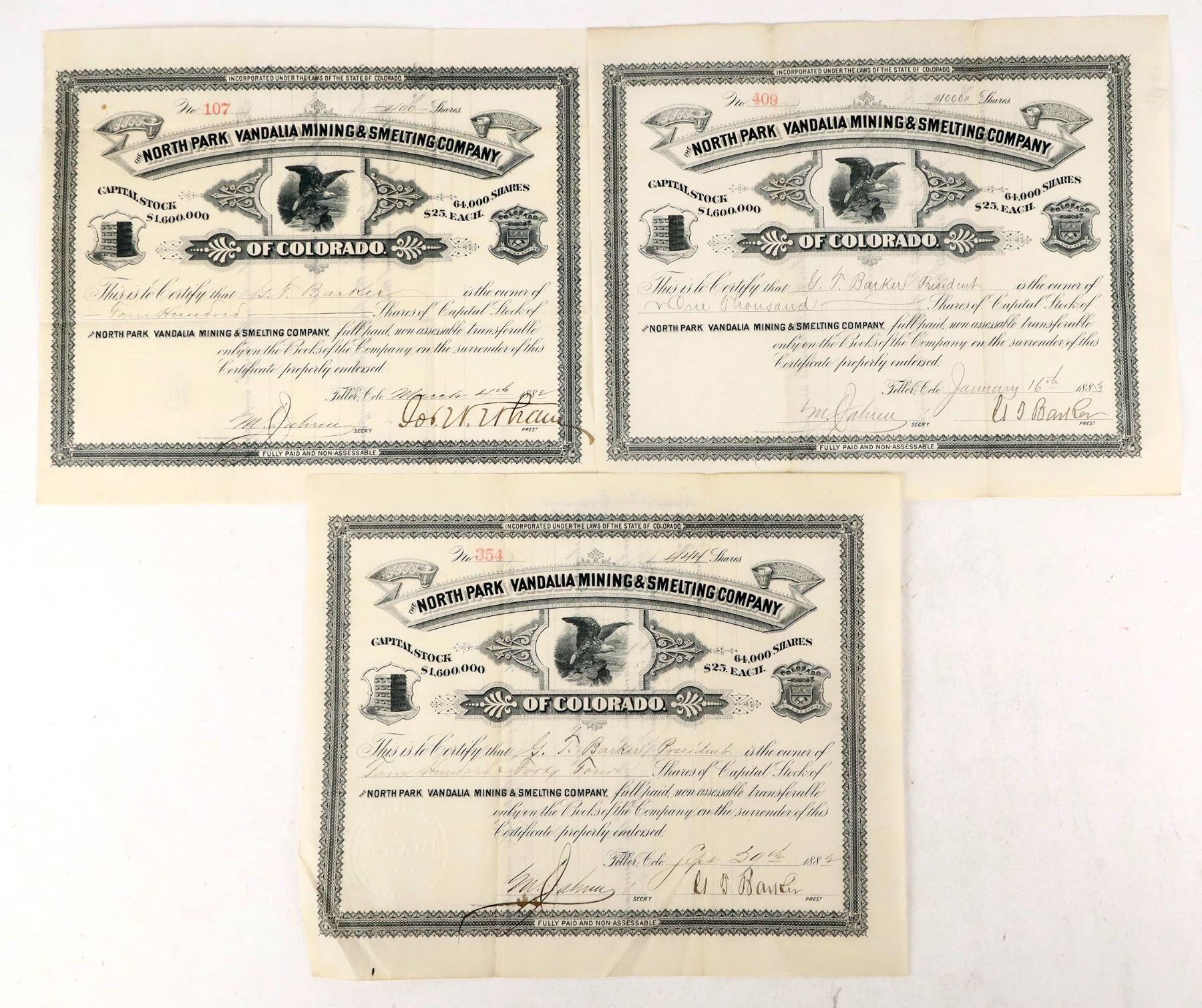 Every now and then we get in a special piece that warms my heart (FH). Here is a doozy, the North Park Vandalia Mining & Smelting Co. Three stocks issued to company president G. T. Barker in 1882-1883, datelined "Teller, Colo." Not cancelled.