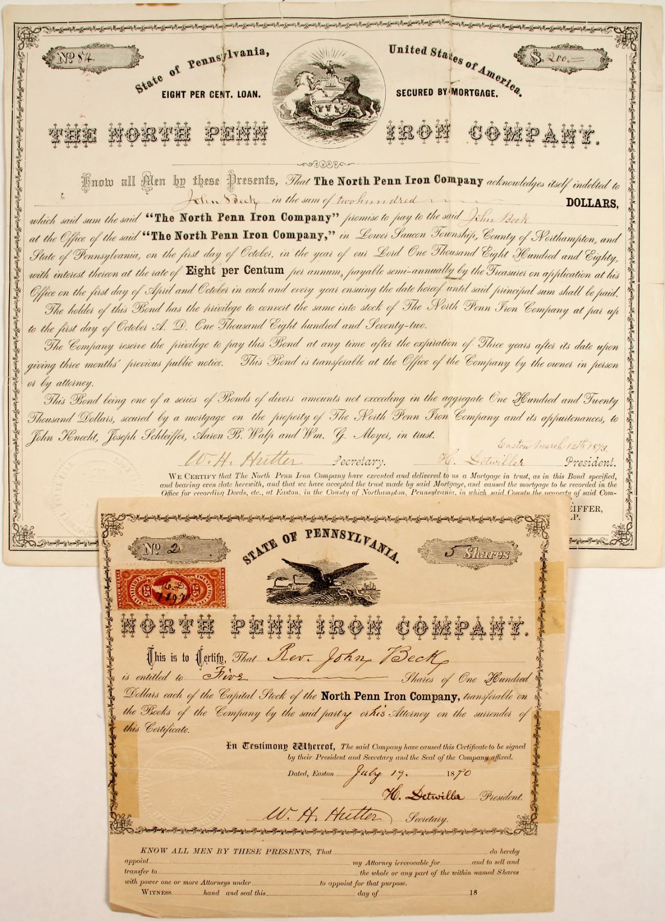 Lot of two. 1) Stock # 2 for 5 shares to the Reverend John Beck. Signed by WH Hutter and president H Dewiller. Dateline Eaton, 1870. Incorporated in 1862. Eagle vignette. 25c Certificate Revenue Stamp. Tears have been taped which show on the borders. Dog ear bottom left. Large tear top left. other smaller issues. mINI2) Bond # 84 for $200. Eight per cent mortgage bond. Same signatures. Issued to John Beck. Reverend John Beck (born in Eaton) a native of York, Pennsylvania was a long-time minister in the German Reformed Church. The bilingual Beck would prove useful in the Civil War, as so many of the wounded soldiers (particularly in the Eleventh Corps) spoke German.Prag Collection