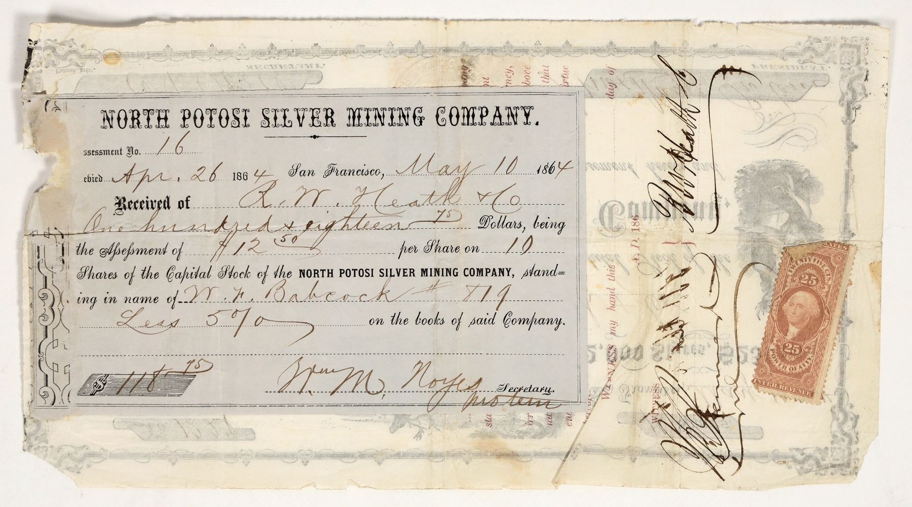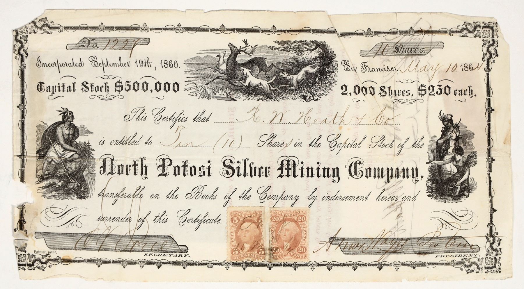 Spectacular and probably the most important territorial we've offered. Very rare to find a territorial stock for a key mine! Incorporated 1860. No. 1227, issued for 10 shares to RW Heath & Co. in San Francisco in May 1864 (see story below, a busy time for this mine!). Signed by pro-term president Amos Noyes and the secretary. Not cancelled. Three vignettes: allegorical women, Native American, and hunting dogs chasing stag. Painter Print. Two revenue stamps. Deep creases, pieces missing at corners and left border. Assessment receipt attached to reverse. 5.5 x 10.5"