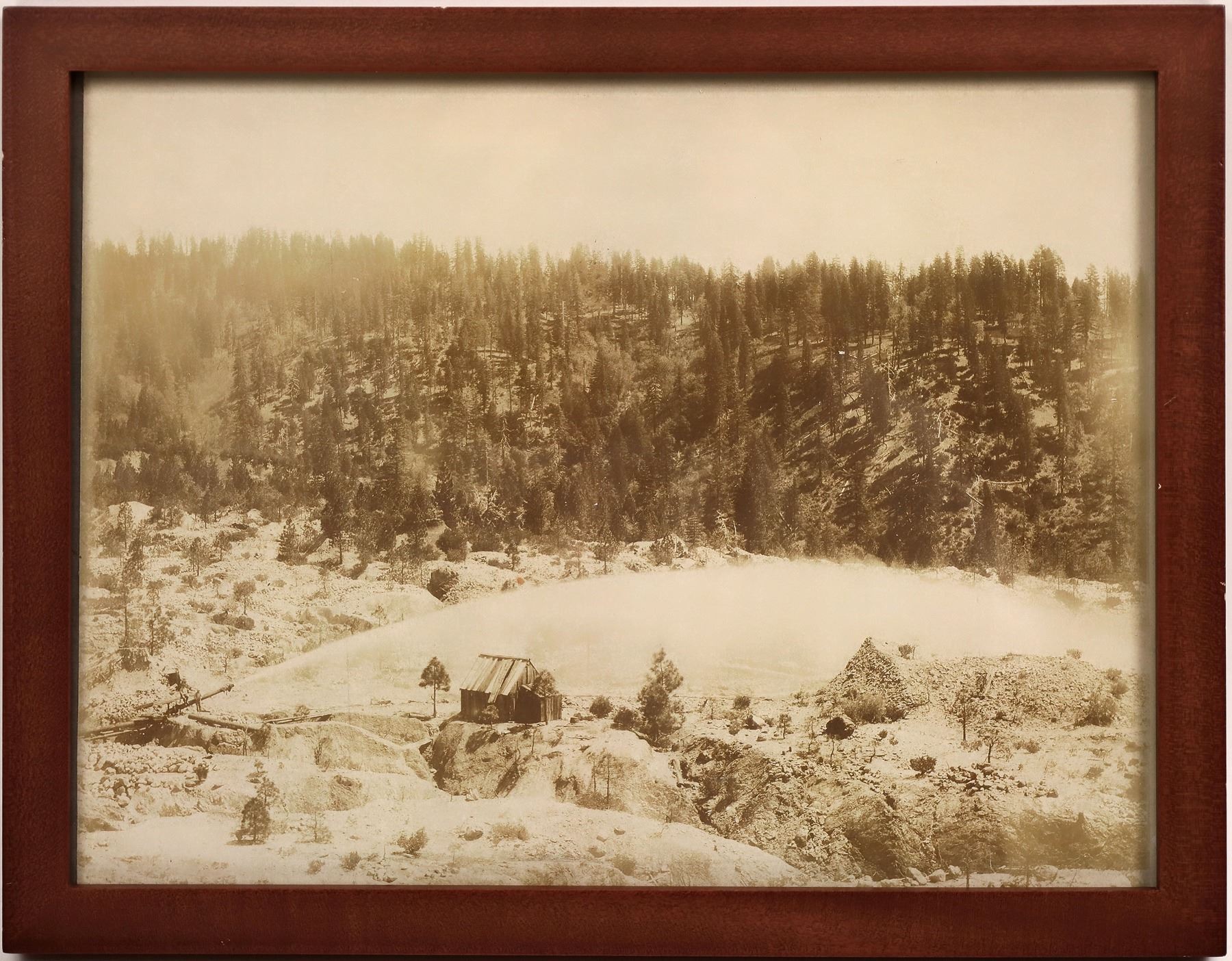 Original photograph of a hydraulic mining operation in North San Juan, California around 1890. There are two men standing next to the hydraulic system that is spraying water across the valley. There is a small cabin in the middle of the scene. Photograph is 12.5 x 9.5 in a nice 14 x 11 wooden frame. Photograph and frame are both in good condition. California