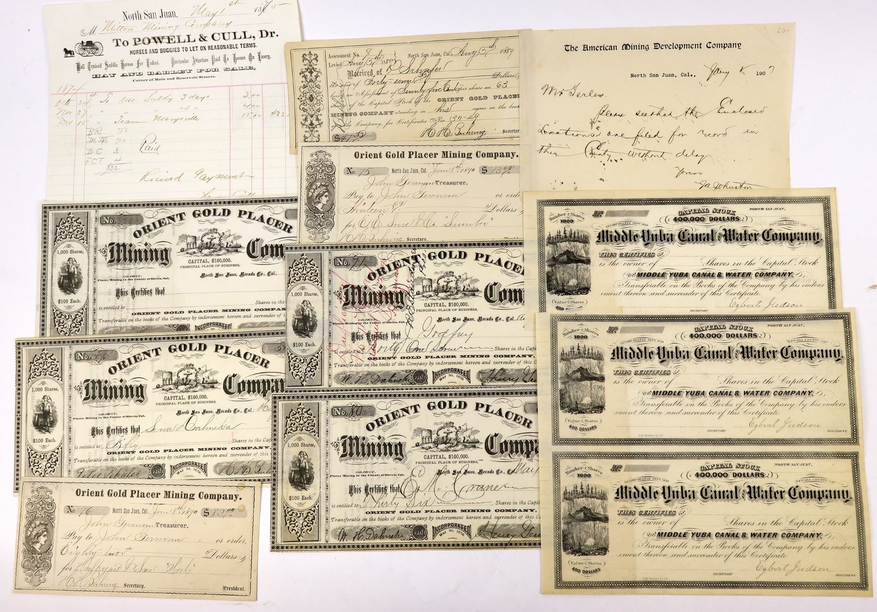 Lot of 11. North San Juan dates back to the California Gold Rush. It prospered during the era of hydraulic mining at nearby Malakoff Diggins from 1850–1884. 1) Orient Gold Placer Mining Company. Four stocks, three issued 1889-1891 (one pen cancelled) and one unissued. Dateline North San Juan. Actual placer mining was in Sierra County. Also three assessment receipts, 1889-1890. 2) Middle Yuba Canal & Water Company. Three unissued stocks, all signed by Egbert Judson as president. Great hydraulic mining vignette. A sheet of two and a single piece. 3) American Mining Development Company note, 1907, about the filing of locations with the county recorder. Dateline North San Juan. 4) Powell & Cull, Horse & Buggies, pictorial billhead, 1875, to the Milton Mining Company. North San Juan, Nevada County California