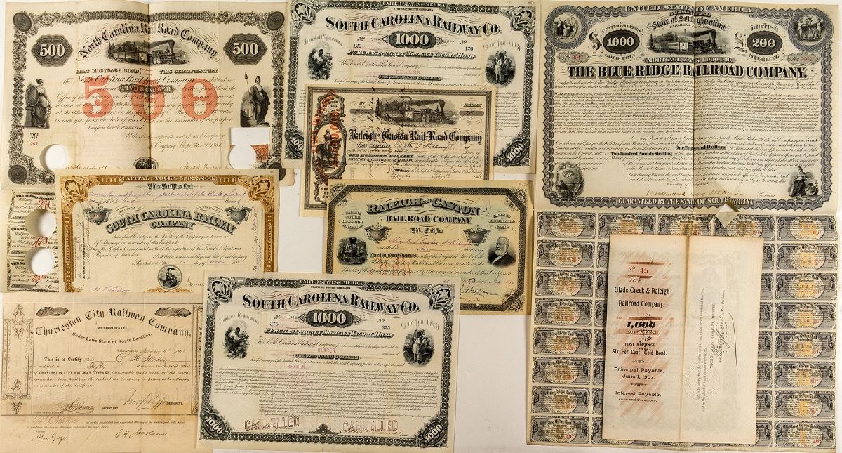 Lot of nine. Very pictorial and attractive group. Includes: South Carolina Railway (two $1,000 bond issued 1881, stamp cancelled and stock issued 1888, not cancelled), Raleigh & Gaston Railroad Co. (stock issued 1862, pen cancelled and different stock issued 1889, punch and pen cancelled), Glade Creek & Raleigh Railroad Co. ($1,000 bond issued 1897, punch cancelled, 15 coupons), Charleston City Railway Co. (stock issued 1868, not cancelled), North Carolina Railroad Co. ($500 bond issued 1867, large punch cancels), and The Blue Ridge Railroad Company ($1,000 bond issued 1869, cut cancelled, 40 coupons attached). (Prag Collection) City: State: North Carolina Date: 1862-1889 hwac# 34226