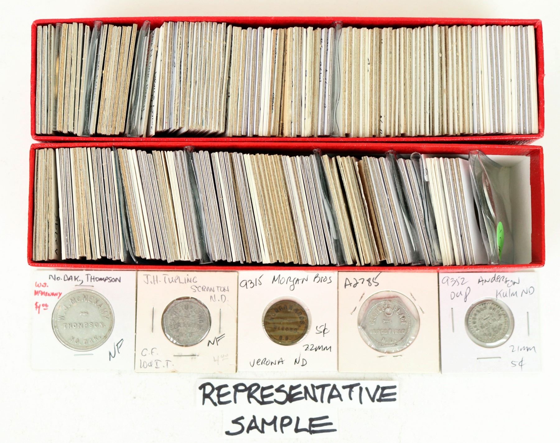 Two nine inch long boxes of North and South Dakota tokens (170 in all). South Dakota: Beresford (2); Delmont; Hitchcock; Meade; Mitchell; Parkston; Pollock (2); Sioux Falls (4) Spencer; Thompson; Valley City (2); Verona (11); Wall Bay; Wener (2); West Hope; Williston; Wimbledon; Wyndmere. North Dakota: Alice; Ashley; Bismarck (5); Carson (2); Chaffee; Christine; Crete (6); Crystal; Devil's Lake; Dickey; Dickinson (2); Fargo (17); Fergus; Finley; Forman; Fortuna; Grand Forks (5); Grand Rapids (4); Great Bend.