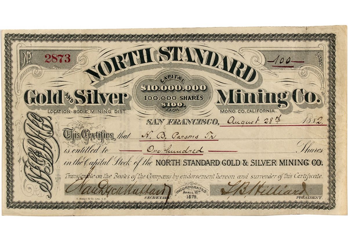 1882. Incorporated April 16th, 1879. Location: Bodie Mining District. Certificate #2873. Issued for one hundred shares to H. B. Parsons on August 28th, 1882. Signed by L.B. Hilliard (President). Signed on reverse by Parsons. Uncancelled. Pinholes on left, folds, and a tape repair top right. Printed by E. Bosqui & Co., S.F. By 1882, the Standard had nearly exhausted its richest ore above the 500-foot level causing a reduction in monthly dividends for Sept. 1882 from $75,000 to $25,000. By the end of 1882, low-grade ore had been discovered below the 500-foot level. (Burchard, pg. 66-67, 1882)City: BodieCounty: MonoState: CADate: