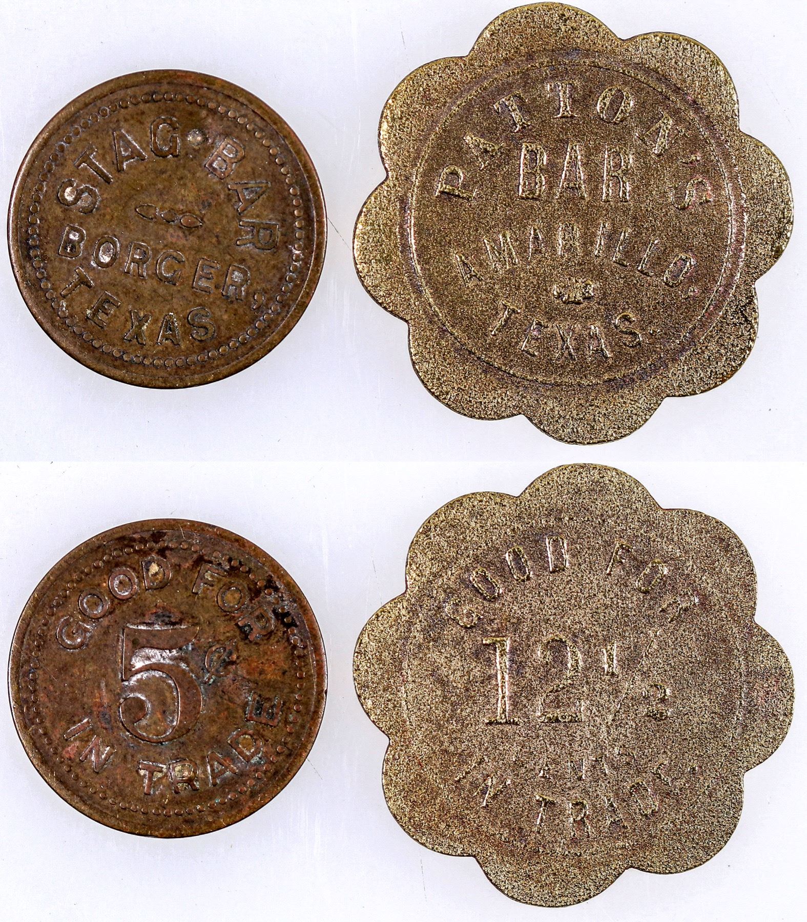 Lot of two Texas tokens: 1) Amarillo Pattens Bar; 2) Borger: Stag Bar.