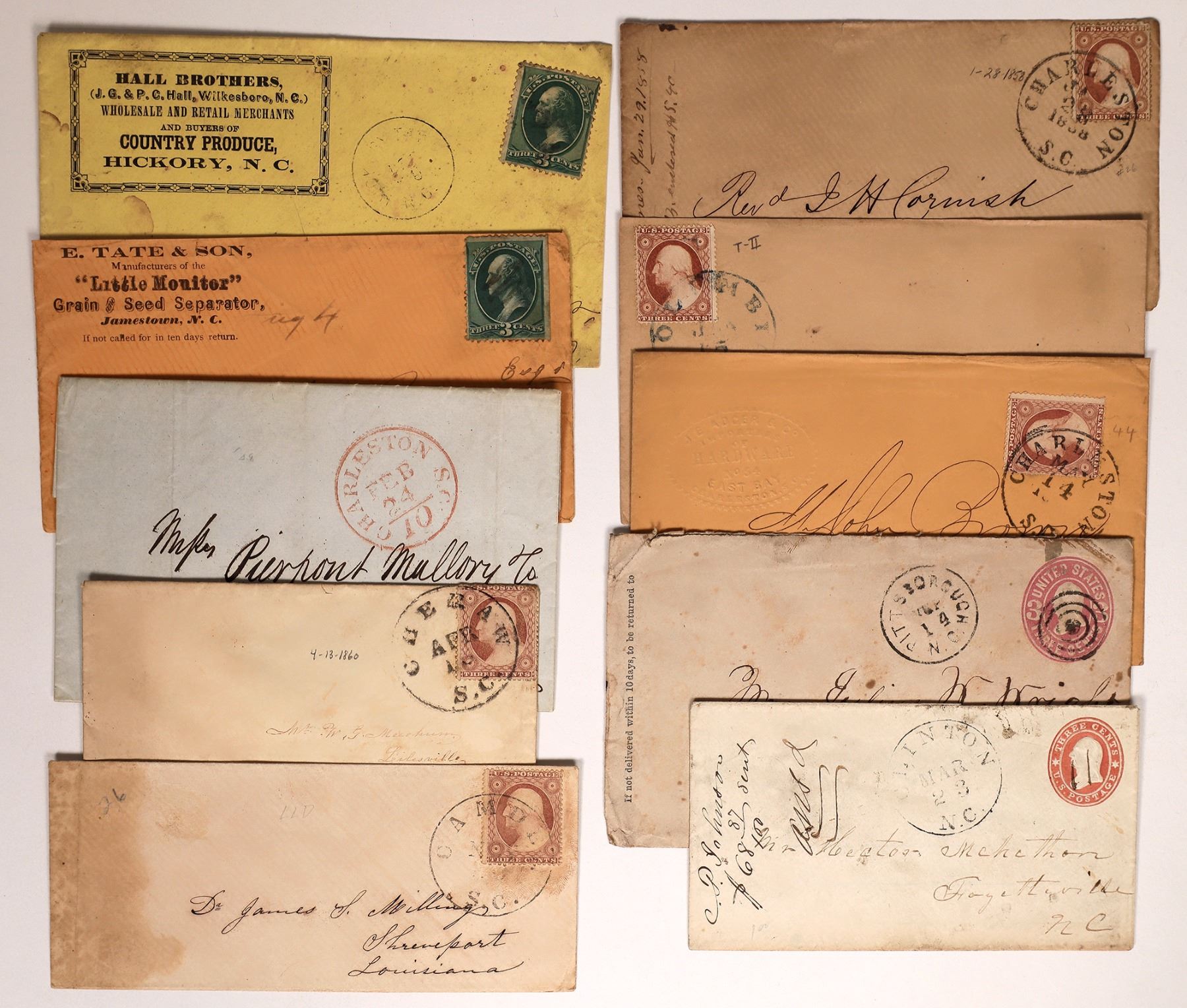 Lot of 10. 1) Stampless cover with content, 1848. 2-3) Two advertising covers: Hall Brothers merchants and Tate & Son grain and seed. 4-10) The rest are circa 1860 and earlier: Clinton, Pittsborough, Columbia, Charleston, Camden, etc.