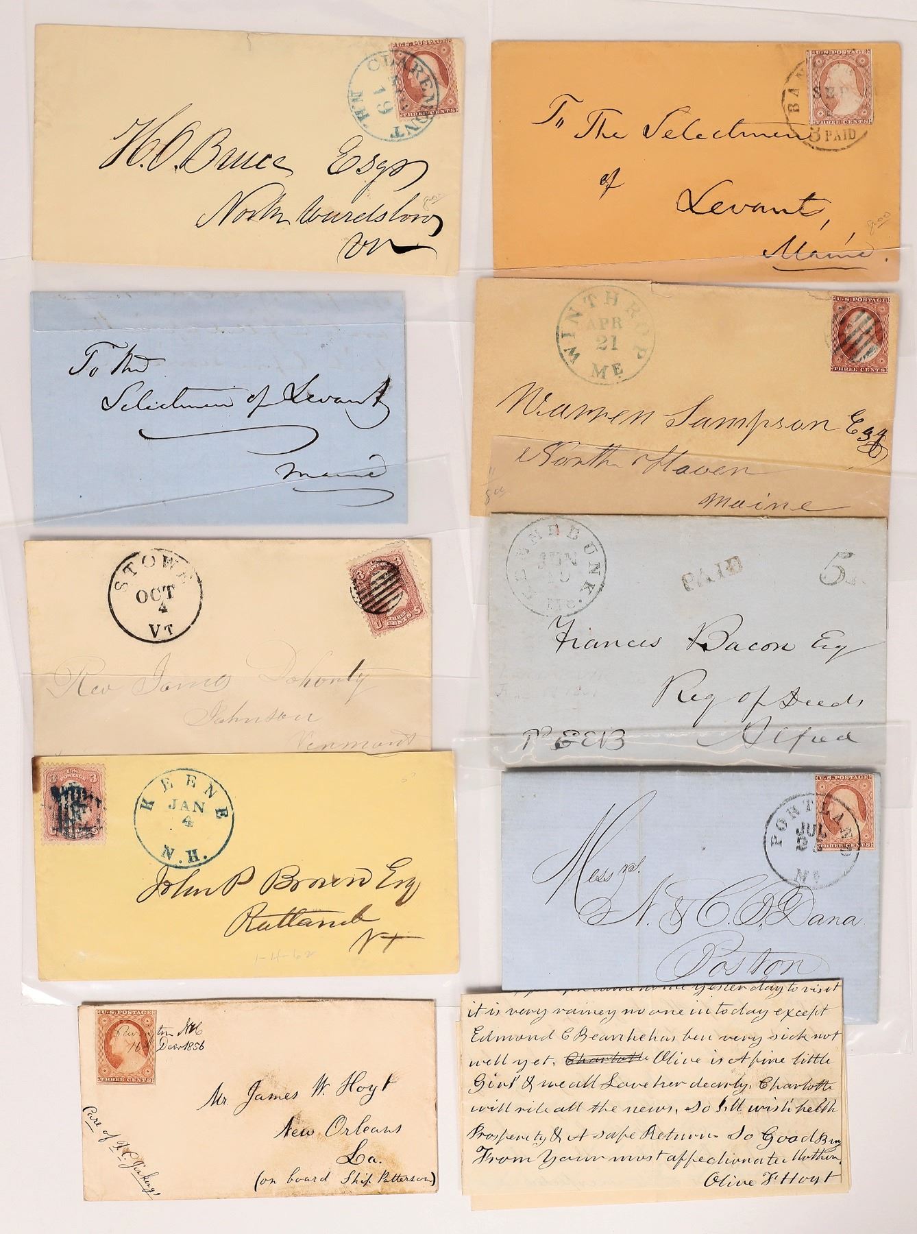 1) 1856 Newington manuscript with contents. Written on cover 'on board Ship Patterson.' 2) Portola Maine stamped letter sheet. 1853. One page letter. 3) Kennebunk, Maine 1851 stampless letter. Short question about mortgaged land.4) Winthrop Maine c 1850/60's. 5) Bancroft (most likely), Maine. Postmark is cancel and the postmark has a '3 PAID'. 6) Keene, New Hampshire. Handwritten year of 1862. 7) Claremont, New Hampshire. 8) Stowe, Vermont. 9) Letter from Bangor 1854 addressed to the selectmen of ???. Letter about city name.