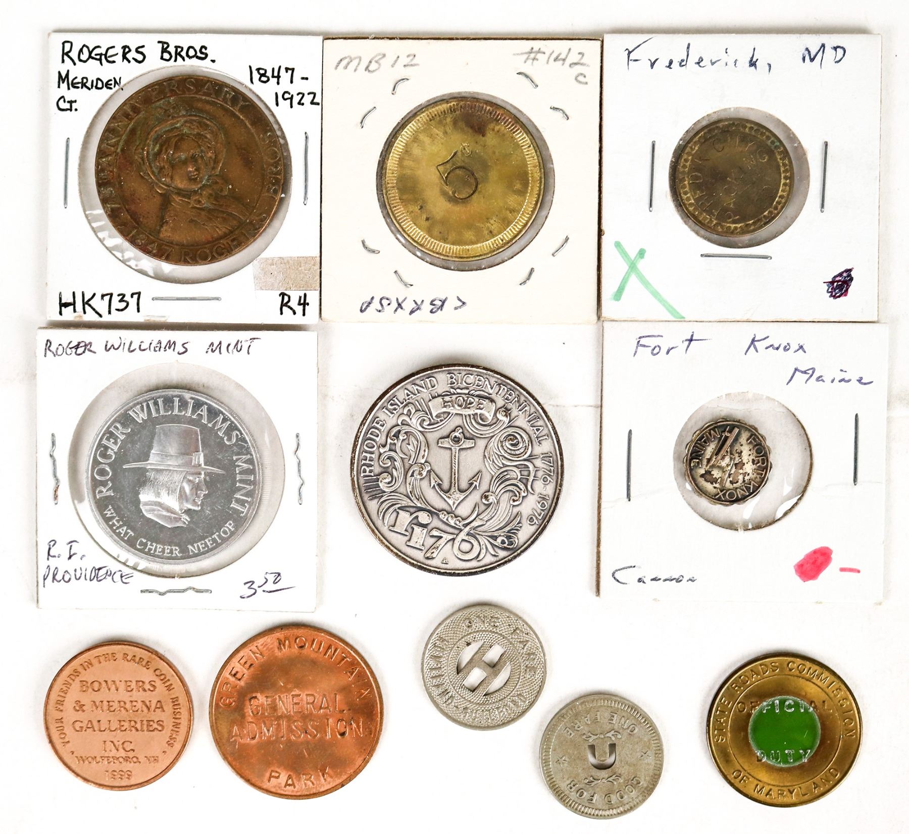 Lot of eleven tokens & medals from New England states: HK-737 Rogers Bros., Meriden, CT; Denniston Co., Newport, RI; Green Mountain Park, VT; Rhode Island Bicentennial; Roger Williams Mint, Providence, RI; Fort Knox, Maine; transportation tokens from Baltimore, MD & the Northeast Expressway. [