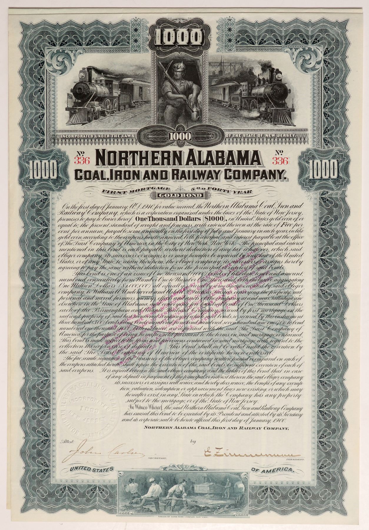 $1,000 Northern Alabama Coal, Iron and Railway Co 1st Mortgage 5%, 40 year Gold Bond, certificate #336. Railway ran from 1895 - 1939. It was succeeded by Southern Railroad. Raised seal, blue border. 79 coupons attached. Signed by E. Zimmerman, president and John Carlson, secretary. Printed: American Bank Note Co. NY. Very nice vignettes: 1) top of certificate two train pictures and worker in middle square box. Bottom of certificate has workers digging in mine. Good condition.